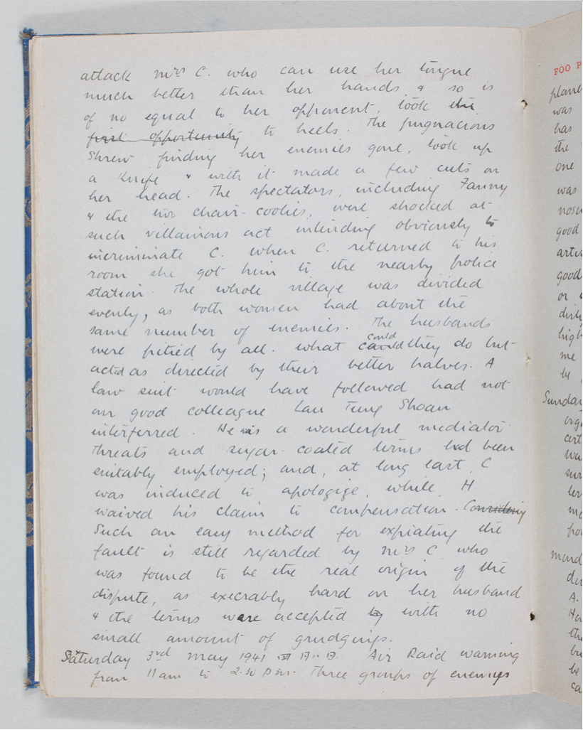 An air raid warning from 11.00 a.m. to 2.30 p.m. Three groups of evening planes, over one hundred in number, flew over us. It was learnt afterwards that poor Chungking had been their objective. Lianglukou as well as the busy part of town has been bombed. One of my rare pleasures at Chungking is to prowl about the streets, randomly nosing around shop windows where our good tradesmen display their artistic taste when exhibiting their beautiful goods, or haply picking up an old book or used article, from an unwholesome, dirty store, if its price is not prohibitively high. Such pleasures will now be denied me, at least, till winter comes and the city is free of air raids.