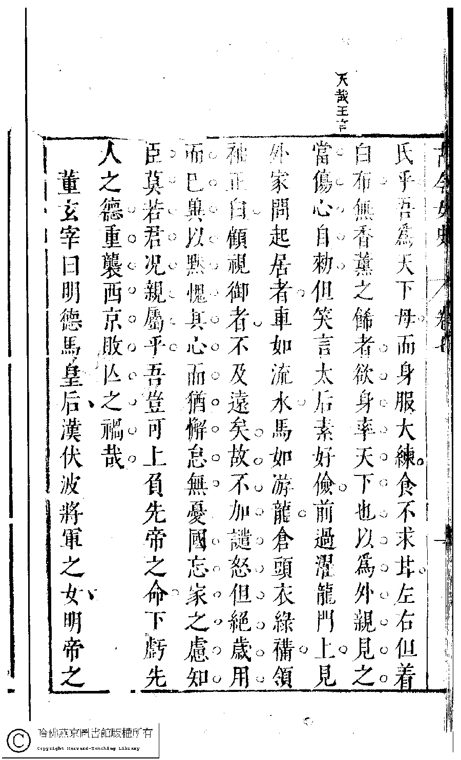 | 不封外戚詔 Bu feng wai qi zhao 文﹕詔 Wen: Zhao 馬皇后(明帝后)﹐號明德馬皇后 Ma huang hou (Mingdi hou), hao: Mingde Ma huang hou 古今女史﹕十二卷﹐詩集﹕八卷﹐附姓氏字里詳節﹕一卷(明趙世杰輯) Gu jin nü shi: 12 juan, shi ji: 8 juan, fu Xing shi zi li xiang jie: 1 juan (edited by Zhao shijie, Ming dynasty) , pp. 7.1a,7.1b. |