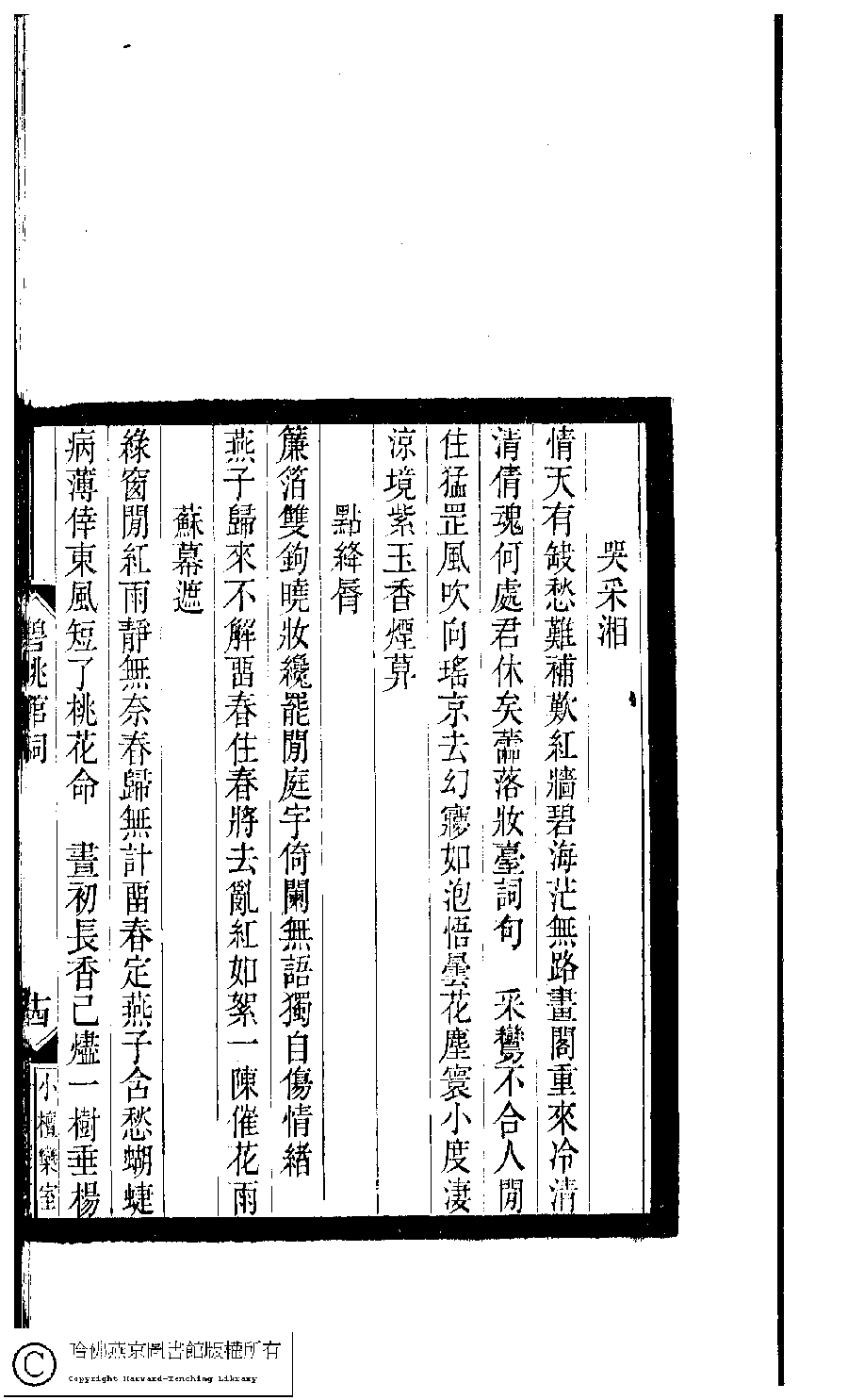 | 月上海棠 : 哭采湘 Yue shang hai tang : Ku Caixiang 詞 ci 趙我佩﹐字君蘭 Zhao Wopei, zi: Junlan 小檀欒室彙刻閨秀詞﹕十集一百種一百卷(清徐乃昌輯) 碧桃館詞﹕一卷 Xiao tan luan shi hui ke gui xiu ci: 10 ji 100 zhong 100 juan (edited by Xu Naichang, Qing dynasty) Bi tao guan ci: 1 juan, pp. 碧桃館詞.13b,碧桃館詞.14a. |
