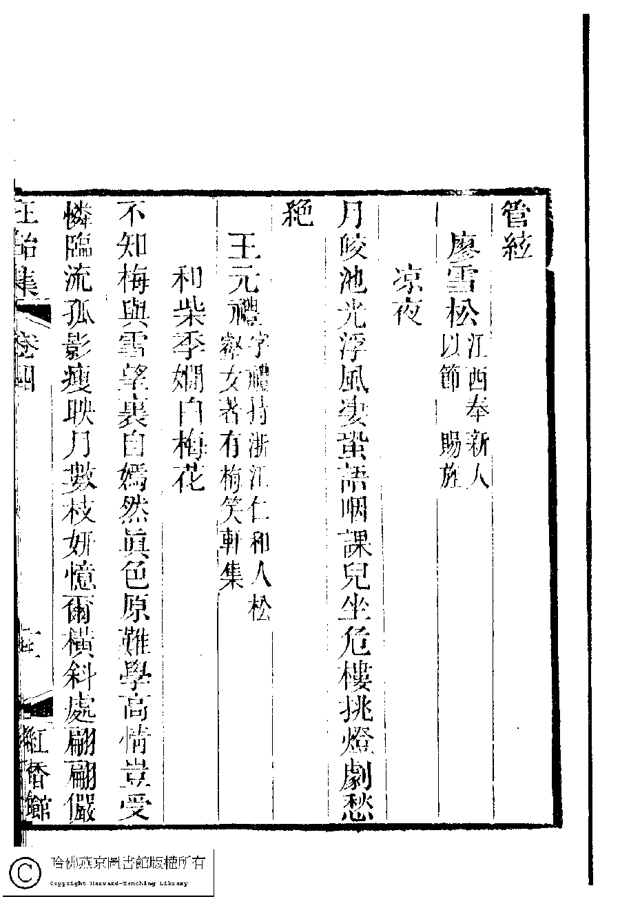 | 和柴季嫺白梅花 He Chai Jixian bai mei hua 詩 - 五言律詩 shi - wuyanlüshi 王元禮﹐字禮持 Wang Yuanli, zi: Lichi 國朝閨秀正始集﹕二十卷﹐附錄﹕一卷﹐補遺﹕一卷﹐又附題詞﹕一卷(清惲珠輯) Guo chao gui xiu zheng shi ji: 20 juan, fu lu: 1 juan, bu yi: 1 juan, you fu ti ci: 1 juan (edited by Yun Zhu, Qing dynasty) , pp. 4.13a,4.13b. |