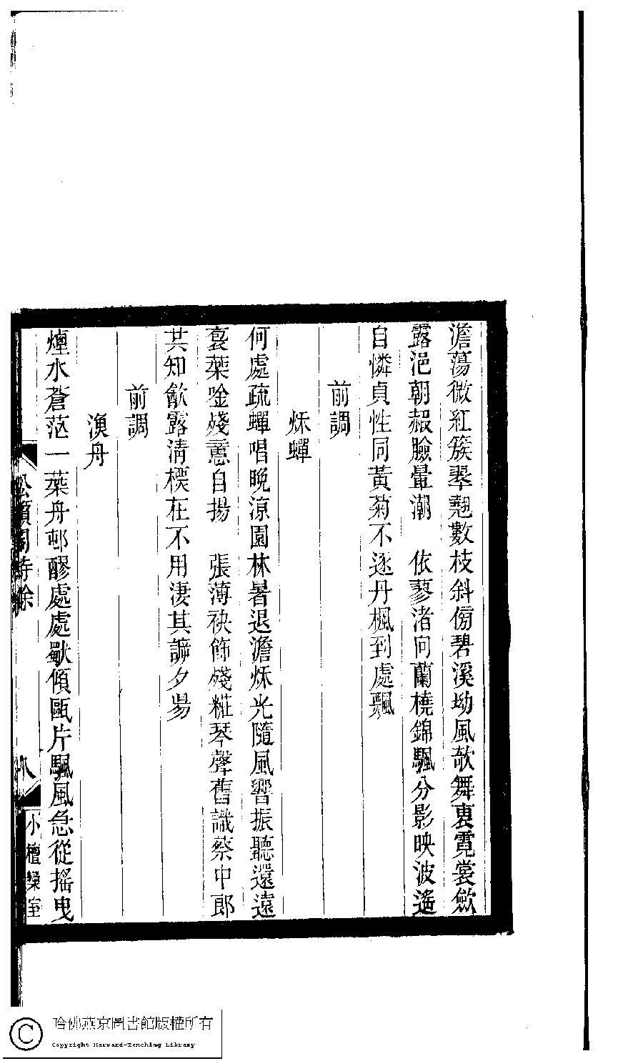 | 前調[鷓鴣天] : 夫容 Qian diao[Zhe gu tian] : Fu rong 詞 ci 沈榛﹐號孟端﹐字伯虔﹐又名端孟 Shen Zhen, hao: Mengduan, zi: Boqian 小檀欒室彙刻閨秀詞﹕十集一百種一百卷(清徐乃昌輯) 松籟閣詩餘﹕一卷 Xiao tan luan shi hui ke gui xiu ci: 10 ji 100 zhong 100 juan (edited by Xu Naichang, Qing dynasty) Song lai ge shi yu: 1 juan, pp. 松籟閣詩餘.7b,松籟閣詩餘.8a. |