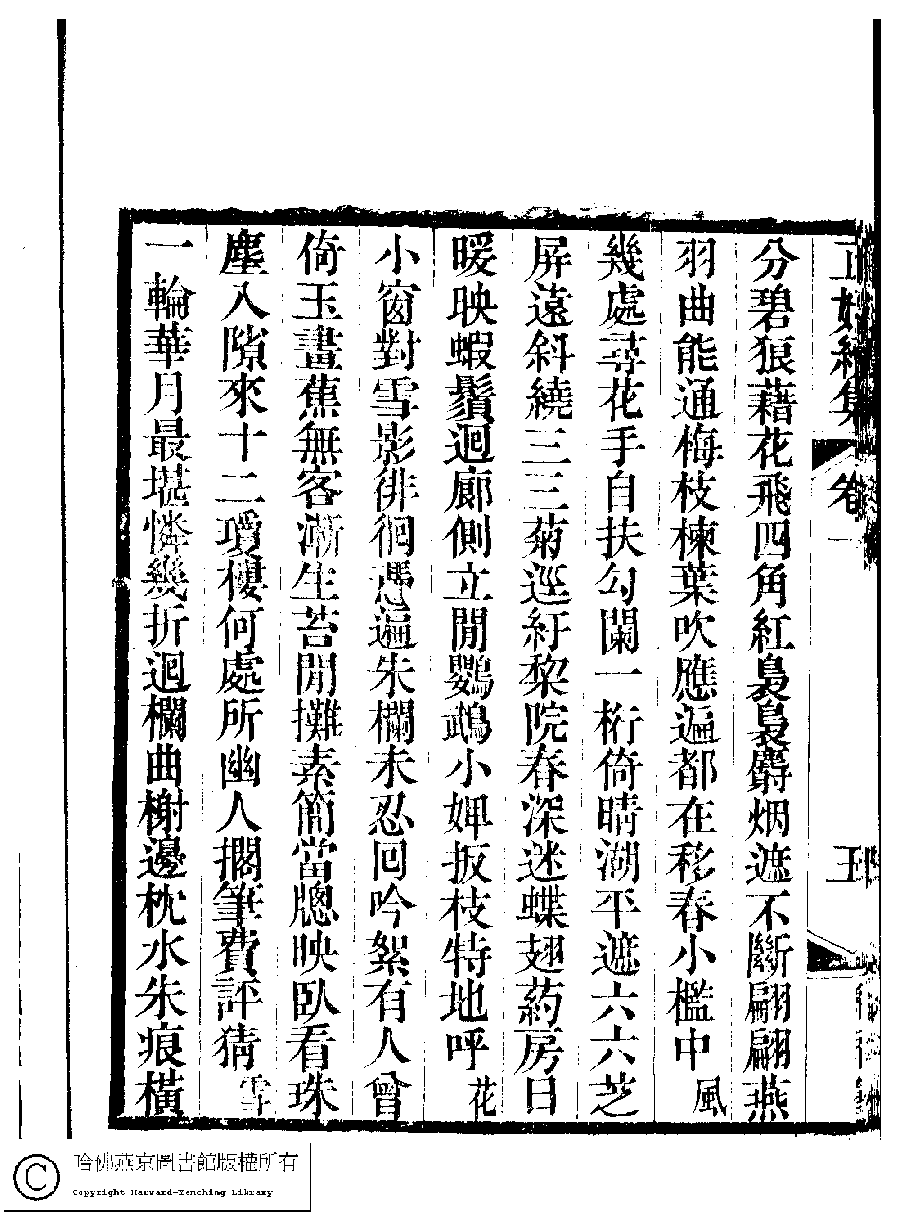 | 闌干四詠 Lan gan si yong 詩 - 七言律詩 shi - qiyanlüshi 席慧文﹐號印蒼﹐字怡珊 Xi Huiwen, hao: Yincang, zi: Yishan 國朝閨秀正始續集﹕十卷﹐附錄﹕一卷﹐補遺﹕一卷﹐輓詞﹕一卷(清惲珠輯) Guo chao gui xiu zheng shi xu ji: 10 juan, fu lu: 1 juan, bu yi: 1 juan, wan ci: 1 juan (edited by Yun Zhu, Qing dynasty) , pp. 1.5a,1.5b,1.6a. |