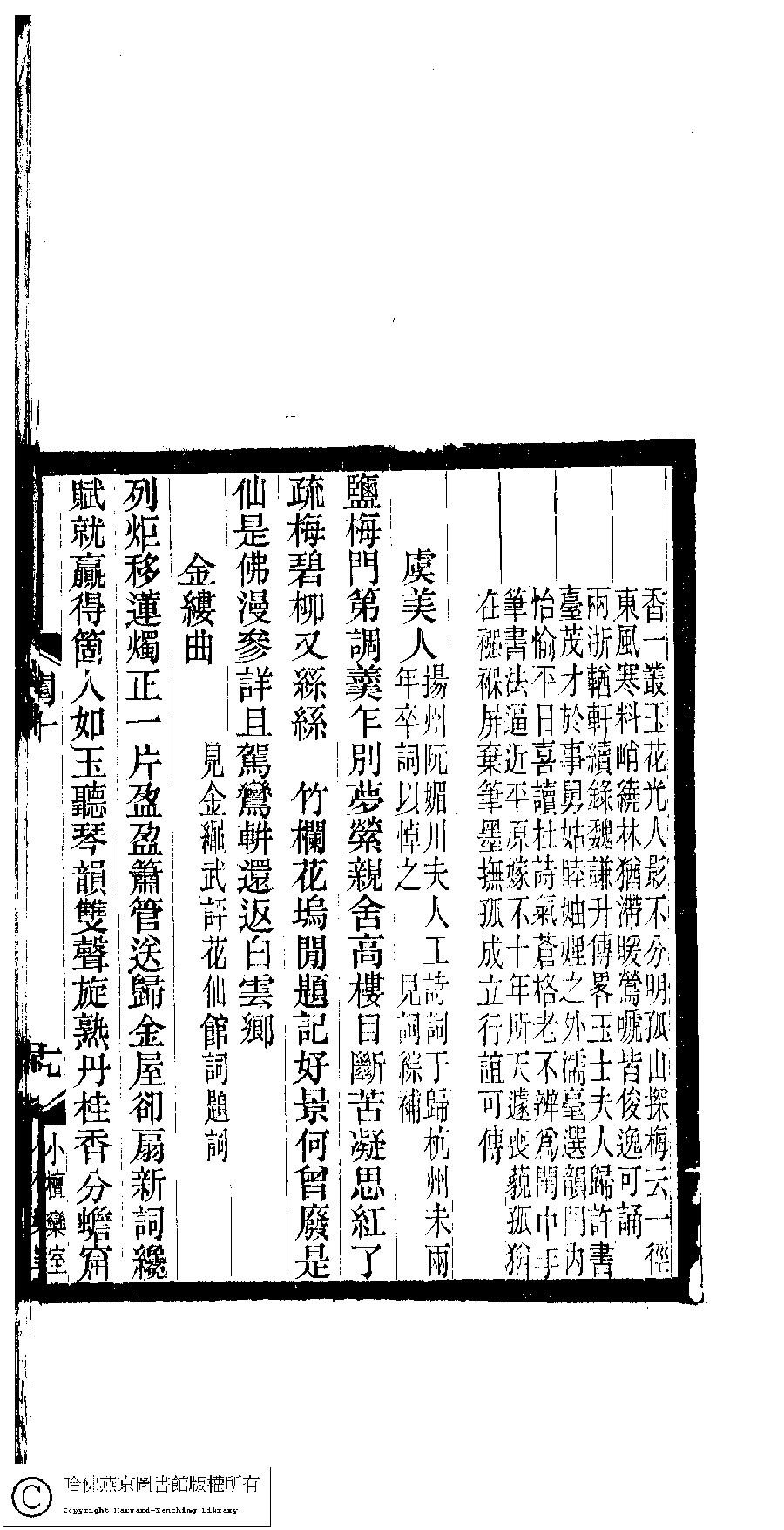 | 虞美人 : 揚州阮媚川夫人工詩詞于歸杭州未兩年卒詞以悼之 Yu mei ren : Yangzhou Ruan Meichuan fu ren gong shi ci yu gui Hangzhou wei liang nian zu ci yi dao zhi 詞 ci 鮑靚﹐字玉士﹐又名尊瑜 Bao Jing, zi: Yushi 閨秀詞鈔﹕十六卷(清徐乃昌輯) Gui xiu ci chao: 16 juan (edited by Xu Naichang, Qing dynasty) , pp. 10.19a. |