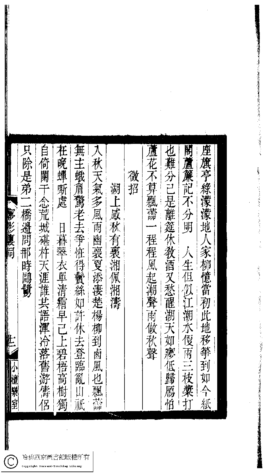 | 徵招 : 湖上感秋有懷湘佩湘濤 Zheng zhao : Hu shang gan qiu you huai Xiangpei Xiangtao 詞 ci 關鍈﹐號妙妙道人﹐字秋芙 Guan Ying, hao: Miaomiaodaoren, zi: Qiufu 小檀欒室彙刻閨秀詞﹕十集一百種一百卷(清徐乃昌輯) 夢影樓詞﹕一卷 Xiao tan luan shi hui ke gui xiu ci: 10 ji 100 zhong 100 juan (edited by Xu Naichang, Qing dynasty) Meng ying lou ci: 1 juan, pp. 夢影樓詞.12a. |