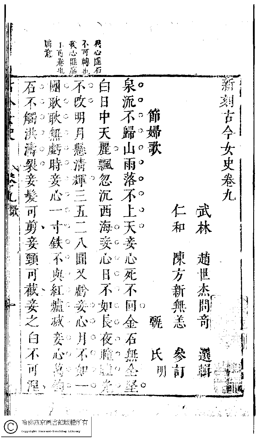 古今女史﹕十二卷﹐詩集﹕八卷﹐附姓氏字里詳節﹕一卷(明趙世杰輯) Gu jin nü shi: 12 juan, shi ji: 8 juan, fu Xing shi zi li xiang jie: 1 juan (edited by Zhao shijie, Ming dynasty) , pp. 9.1a,9.1b.