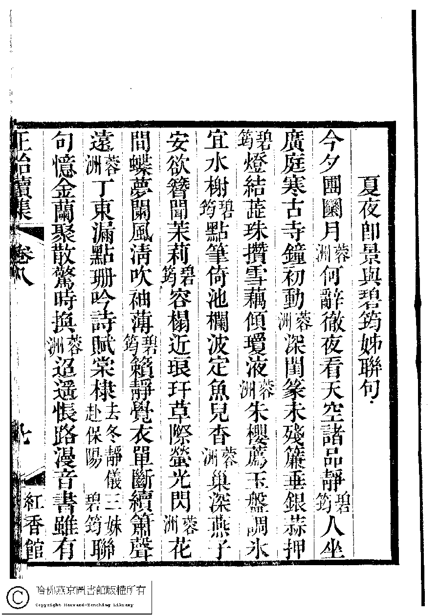 | 夏夜即景與碧筠姊聯句 Xia ye ji jing yu Biyun zi lian ju 詩 - 五言聯句 shi - wuyanlianju 盧介祺﹐號蓉洲 Lu Jieqi, hao: Rongzhou 國朝閨秀正始續集﹕十卷﹐附錄﹕一卷﹐補遺﹕一卷﹐輓詞﹕一卷(清惲珠輯) Guo chao gui xiu zheng shi xu ji: 10 juan, fu lu: 1 juan, bu yi: 1 juan, wan ci: 1 juan (edited by Yun Zhu, Qing dynasty) , pp. 8.7a,8.7b. |