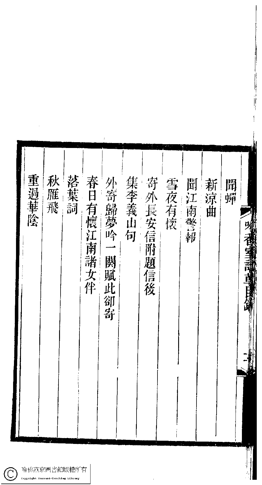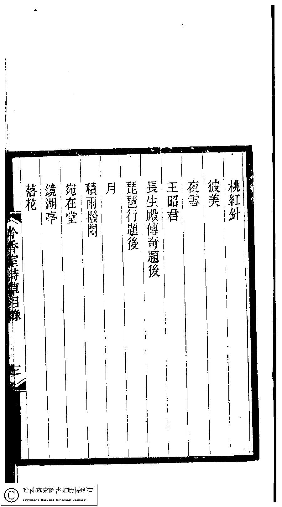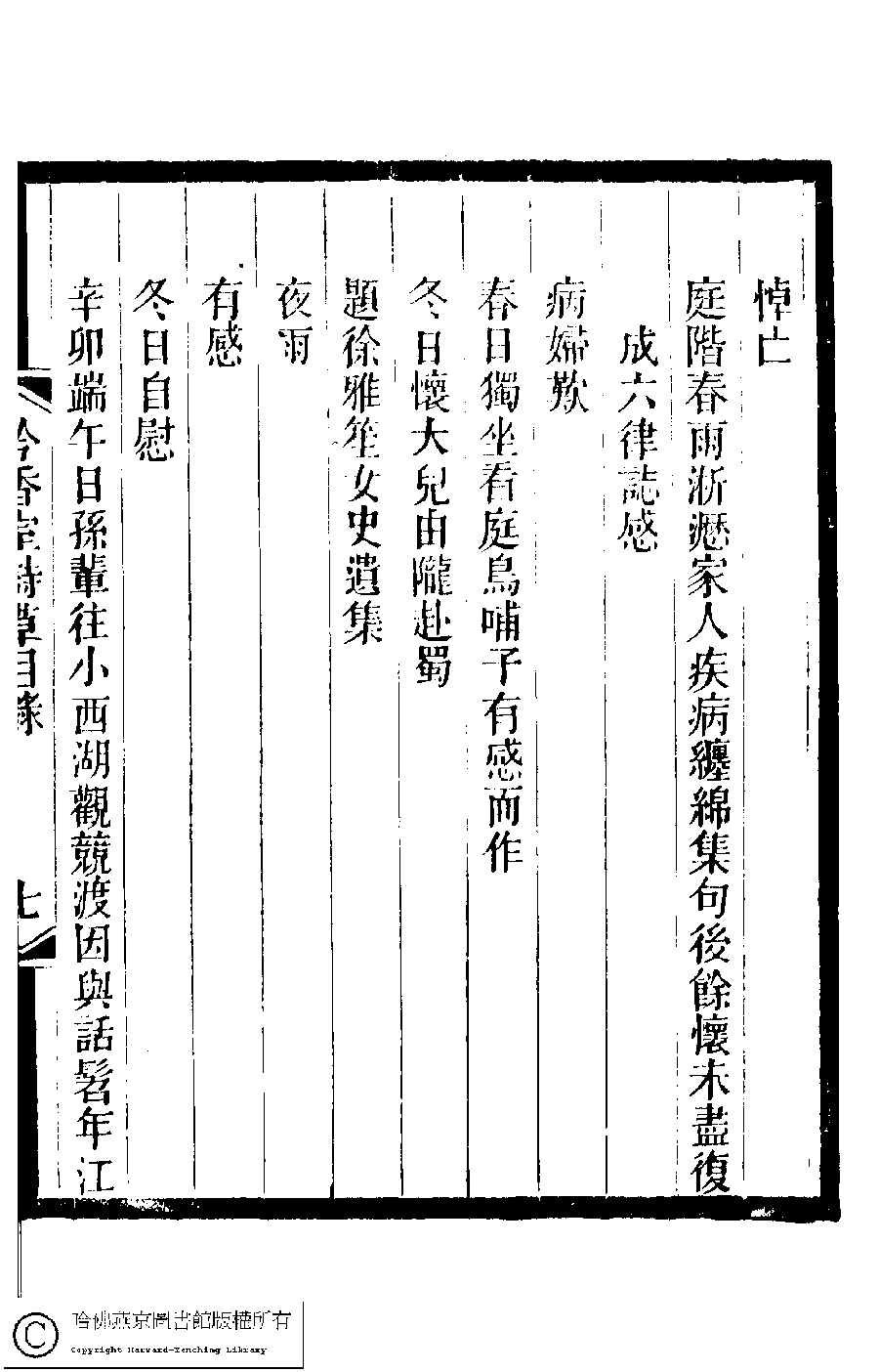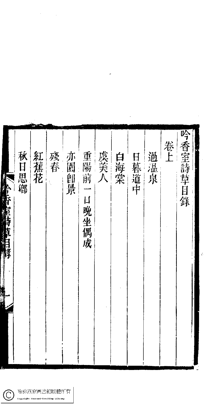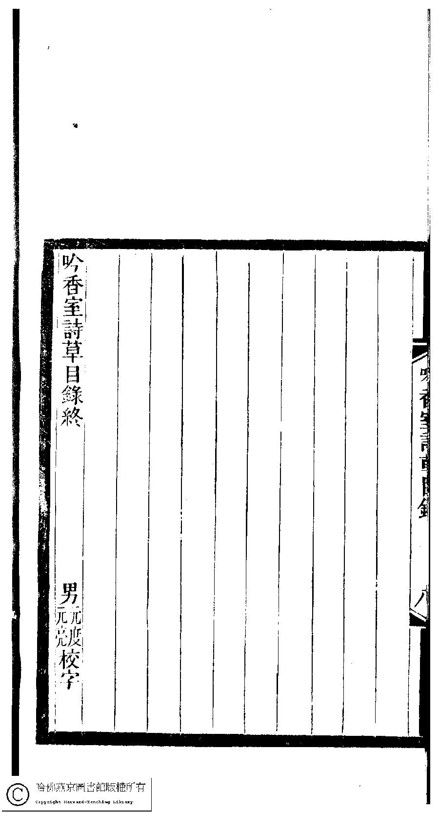 | 吟香室詩草目錄 Yin xiang shi shi cao mu lu 吟香室詩草﹕二卷﹐續刻﹕一卷﹐附刻﹕一卷(清楊蘊輝撰) Yin xiang shi shi cao: 2 juan, xu ke: 1 juan, fu ke: 1 juan (by Yang Yunhui, Qing dynasty) , pp. 目錄.1a,目錄.1b,目錄.2a,目錄.2b,目錄.3a,目錄.3b,目錄.4a,目錄.4b,目錄.5a,目錄.5b,目錄.6a,目錄.6b,目錄.7a,目錄.7b,目錄.8a,目錄.8b. |