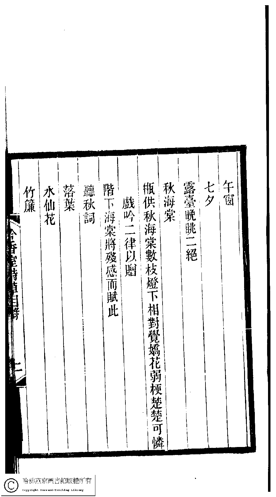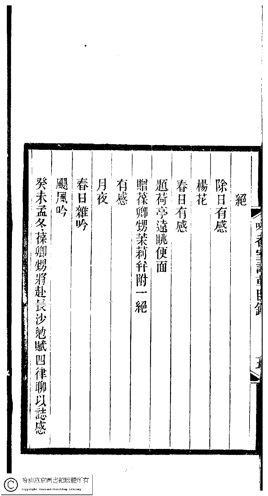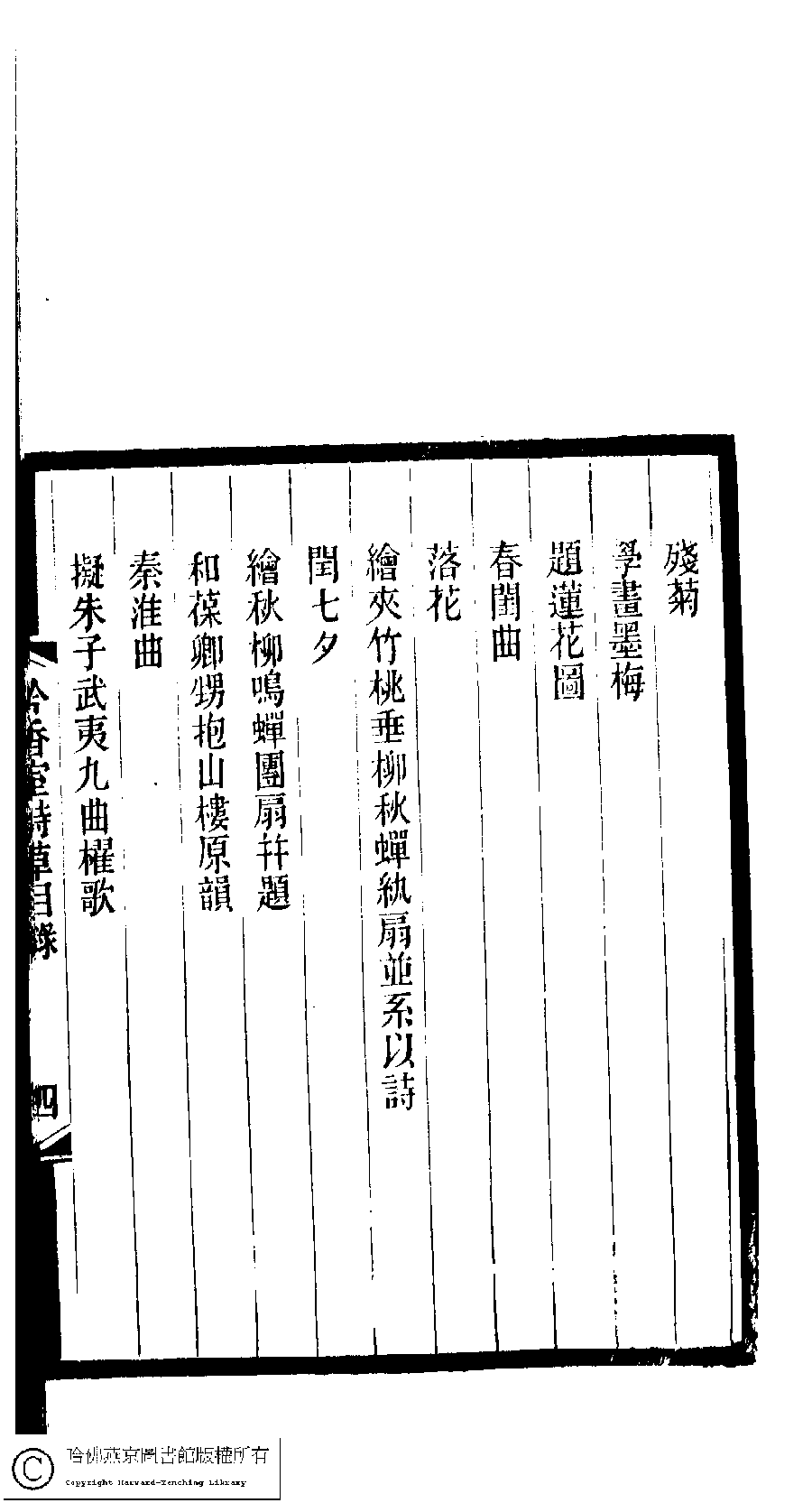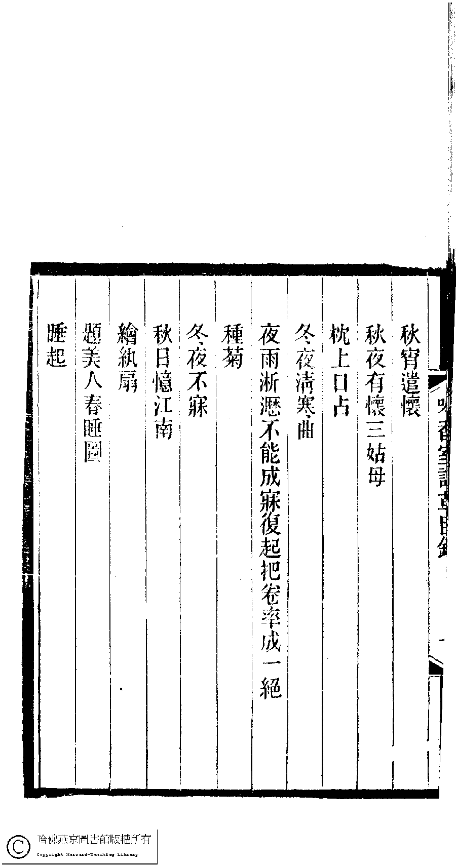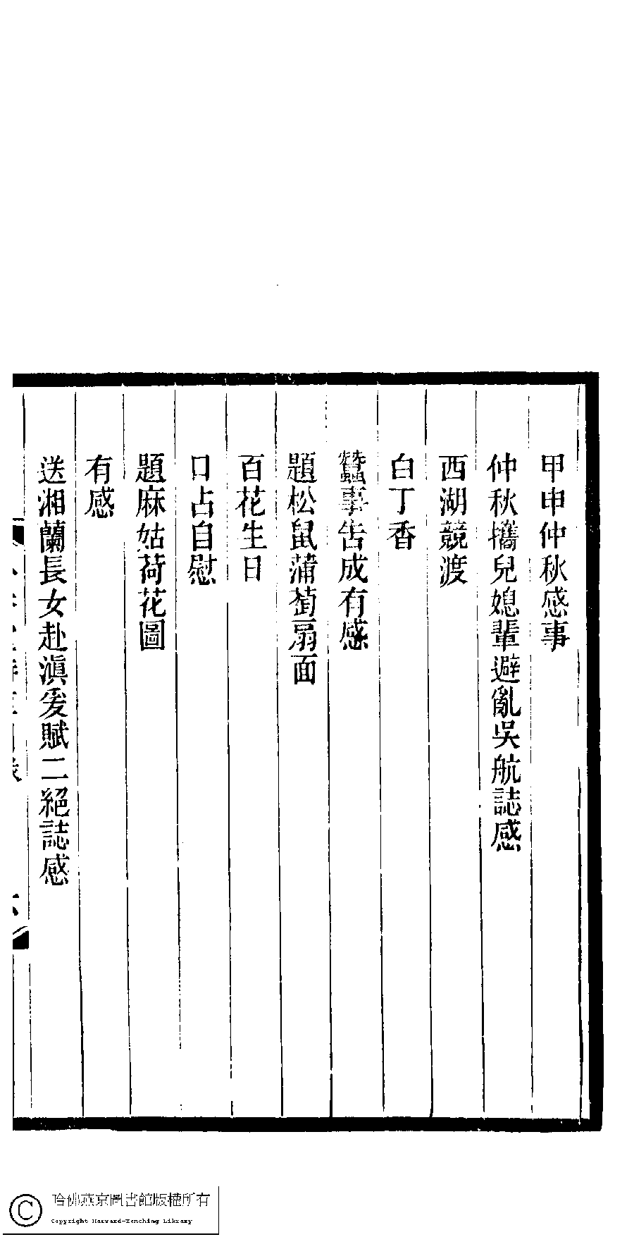 | 吟香室詩草目錄 Yin xiang shi shi cao mu lu 吟香室詩草﹕二卷﹐續刻﹕一卷﹐附刻﹕一卷(清楊蘊輝撰) Yin xiang shi shi cao: 2 juan, xu ke: 1 juan, fu ke: 1 juan (by Yang Yunhui, Qing dynasty) , pp. 目錄.1a,目錄.1b,目錄.2a,目錄.2b,目錄.3a,目錄.3b,目錄.4a,目錄.4b,目錄.5a,目錄.5b,目錄.6a,目錄.6b,目錄.7a,目錄.7b,目錄.8a,目錄.8b. |