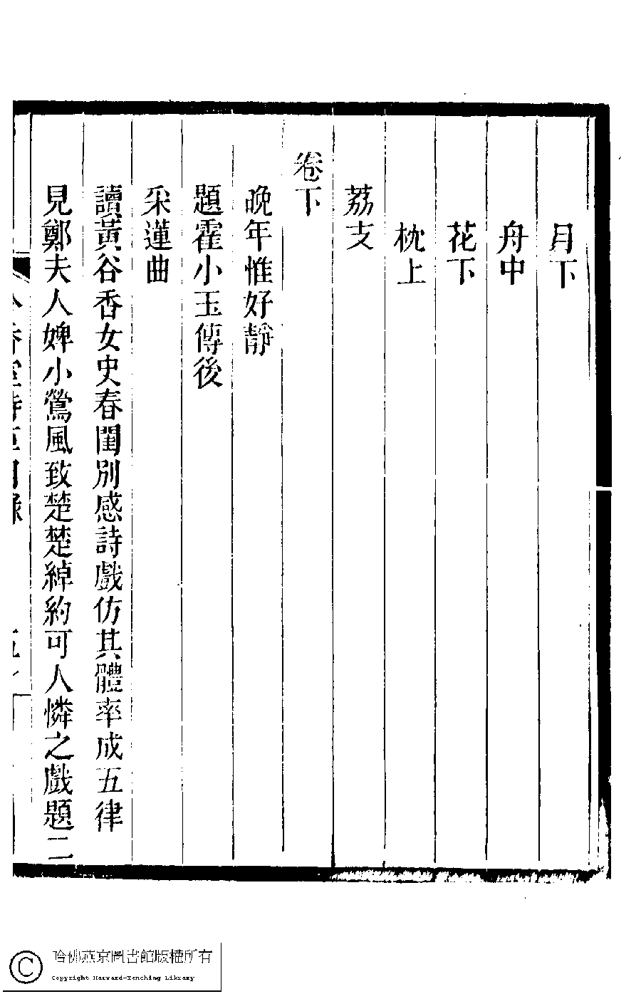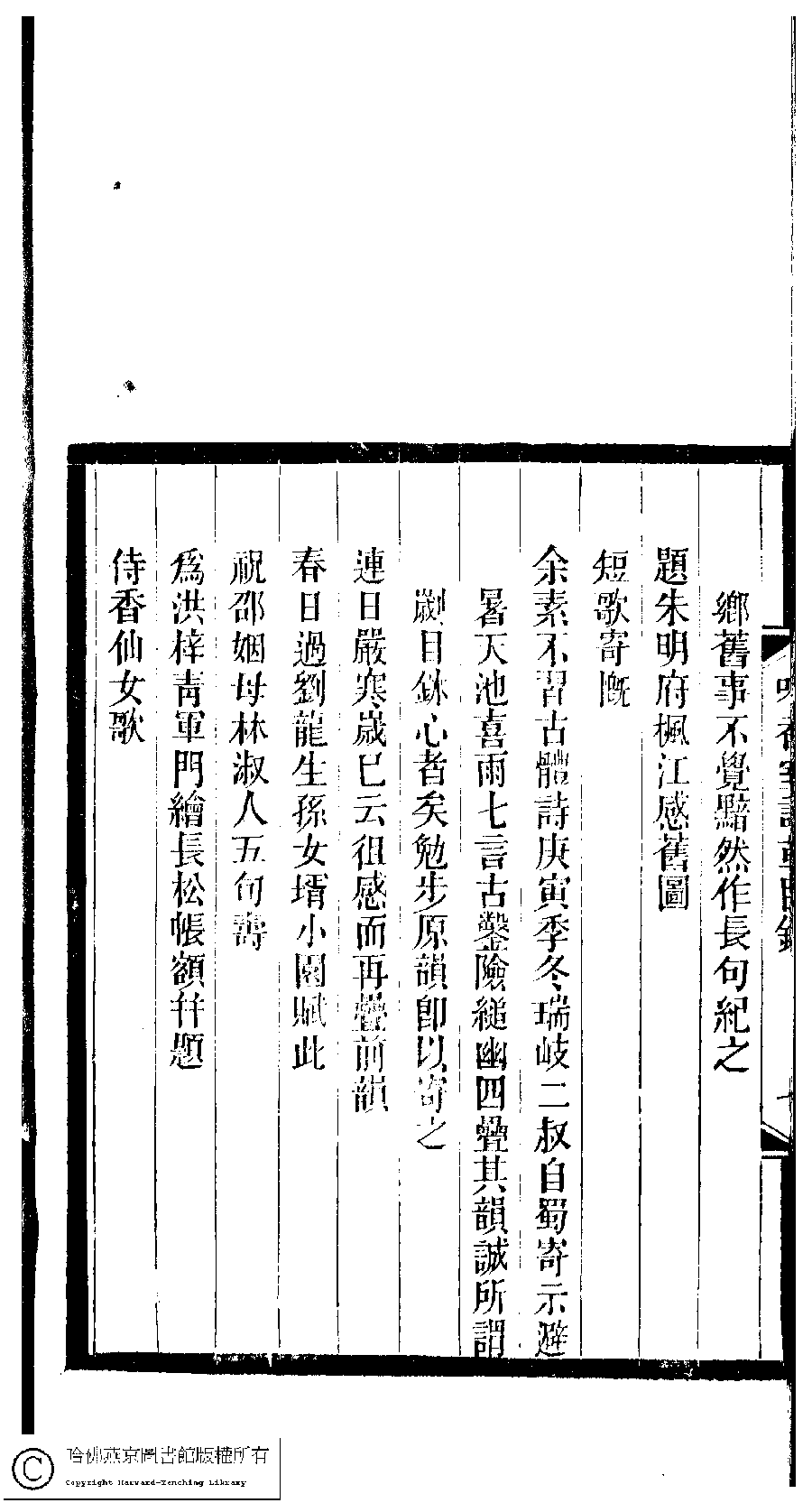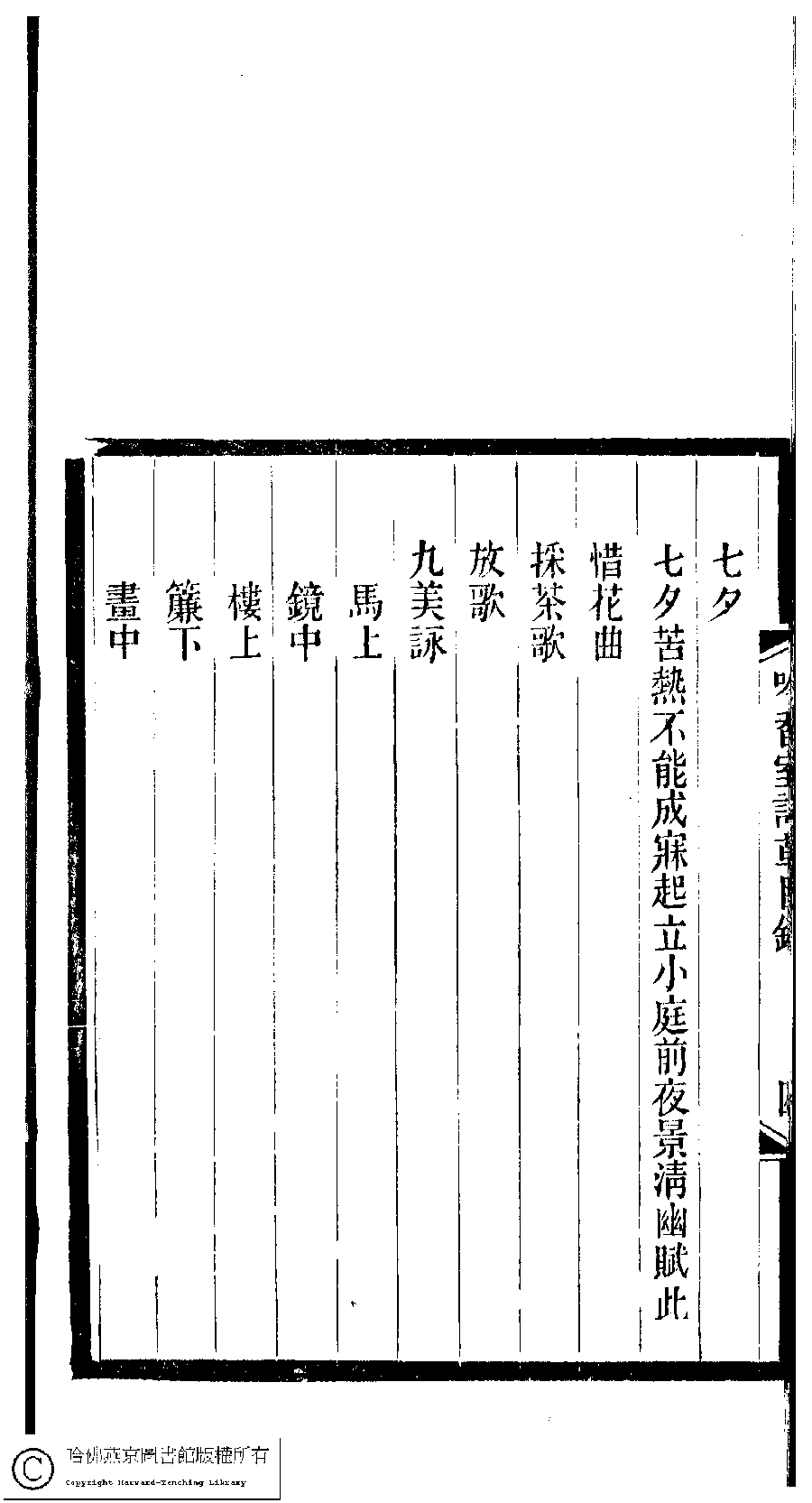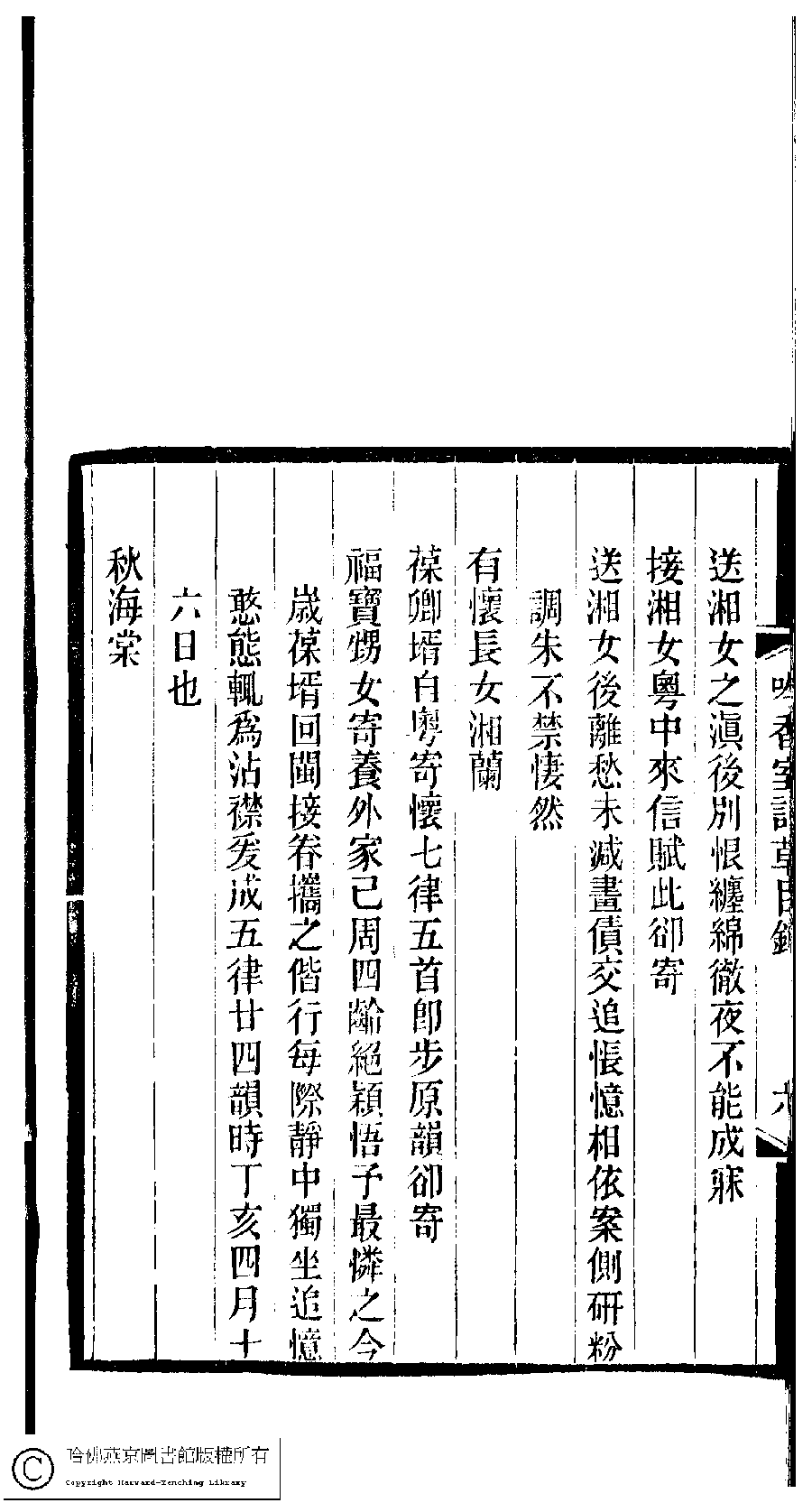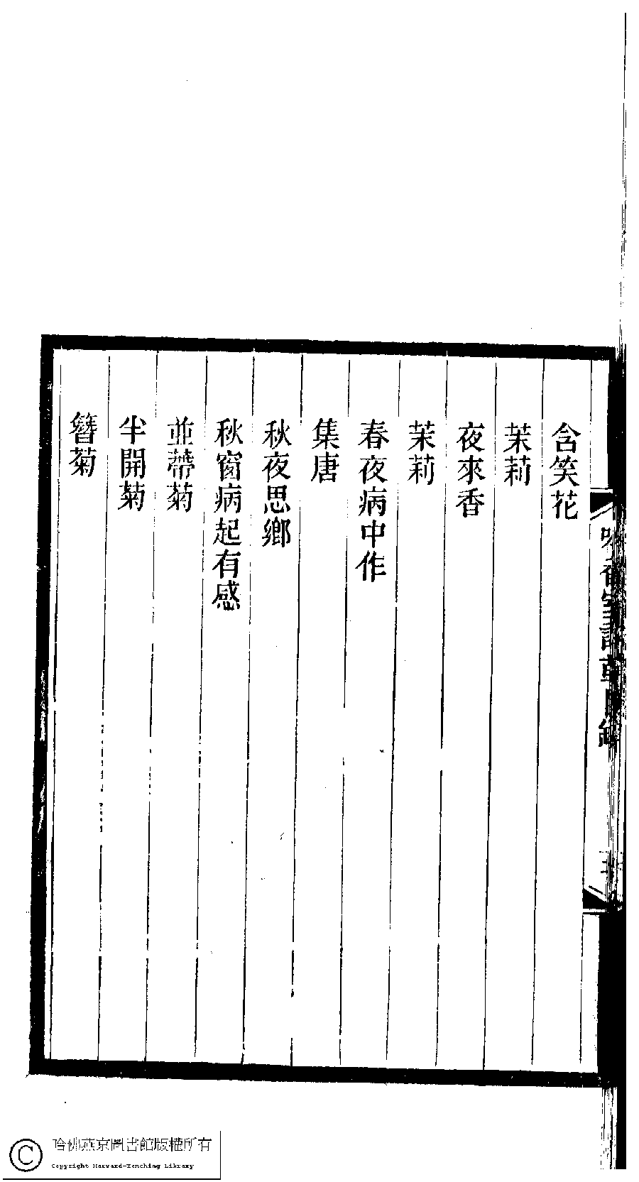 | 吟香室詩草目錄 Yin xiang shi shi cao mu lu 吟香室詩草﹕二卷﹐續刻﹕一卷﹐附刻﹕一卷(清楊蘊輝撰) Yin xiang shi shi cao: 2 juan, xu ke: 1 juan, fu ke: 1 juan (by Yang Yunhui, Qing dynasty) , pp. 目錄.1a,目錄.1b,目錄.2a,目錄.2b,目錄.3a,目錄.3b,目錄.4a,目錄.4b,目錄.5a,目錄.5b,目錄.6a,目錄.6b,目錄.7a,目錄.7b,目錄.8a,目錄.8b. |