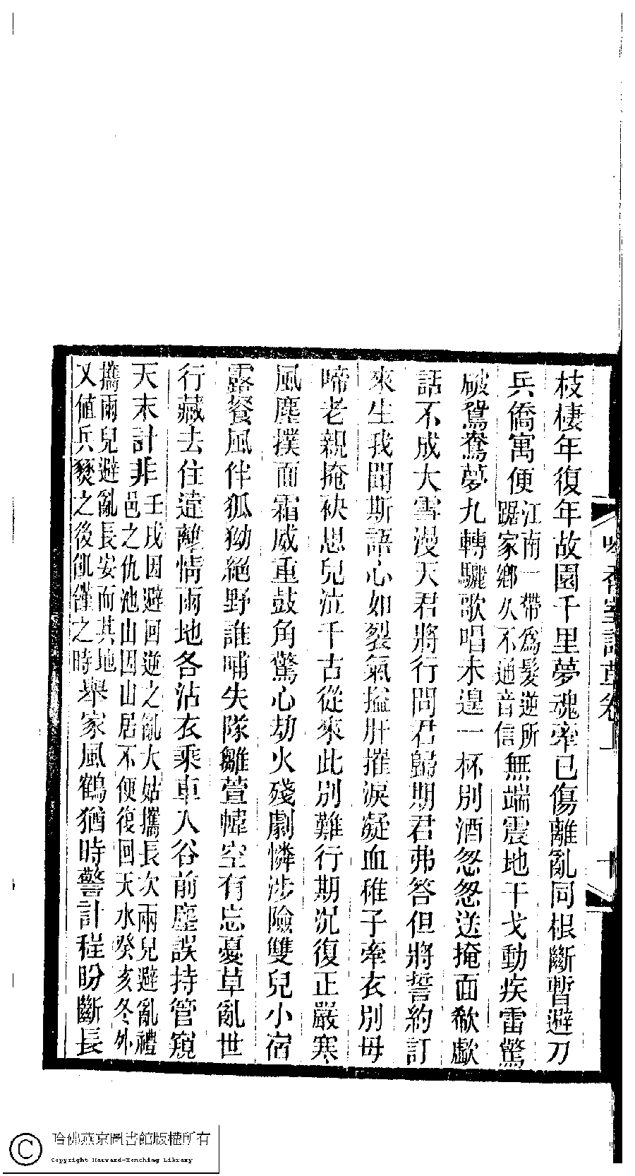 | 外寄歸夢吟一闋賦此卻寄 Wai ji gui meng yin yi que fu ci que ji 詩 - 七言古詩 shi - qiyangushi 楊蘊輝﹐字靜貞 Yang Yunhui, zi: Jingzhen 吟香室詩草﹕二卷﹐續刻﹕一卷﹐附刻﹕一卷(清楊蘊輝撰) Yin xiang shi shi cao: 2 juan, xu ke: 1 juan, fu ke: 1 juan (by Yang Yunhui, Qing dynasty) , pp. 1.10a,1.10b,1.11a. |