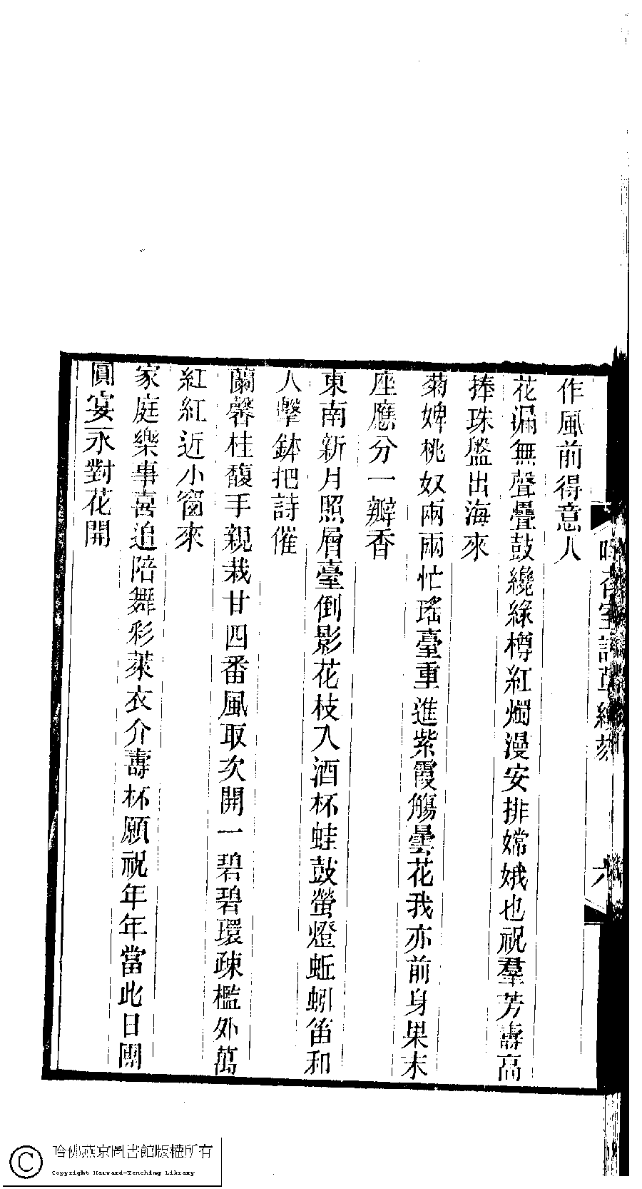 | 辛丑花朝率兒媳孫女輩小集挹爽園剪綵為各色花幡綴樹為賀并賦六絕以誌清遊 Xin chou hua zhao shuai er xi sun nü bei xiao ji Yi shuang yuan jian cai wei ge se hua fan zhui shu wei he bing fu liu jue yi zhi qing you 詩 - 七言絕句 shi - qiyanjueju 楊蘊輝﹐字靜貞 Yang Yunhui, zi: Jingzhen 吟香室詩草﹕二卷﹐續刻﹕一卷﹐附刻﹕一卷(清楊蘊輝撰) Yin xiang shi shi cao: 2 juan, xu ke: 1 juan, fu ke: 1 juan (by Yang Yunhui, Qing dynasty) , pp. 續刻.6a,續刻.6b. |