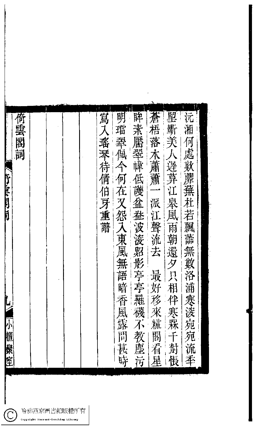 | 國香慢 : 詠水仙 Guo xiang man : Yong shui xian 詞 ci 張友書﹐字靜宜 Zhang Youshu, zi: Jingyi 小檀欒室彙刻閨秀詞﹕十集一百種一百卷(清徐乃昌輯) 倚雲閣詞﹕一卷 Xiao tan luan shi hui ke gui xiu ci: 10 ji 100 zhong 100 juan (edited by Xu Naichang, Qing dynasty) Yi yun ge ci: 1 juan, pp. 1.8b,1.9a,1.9b. |