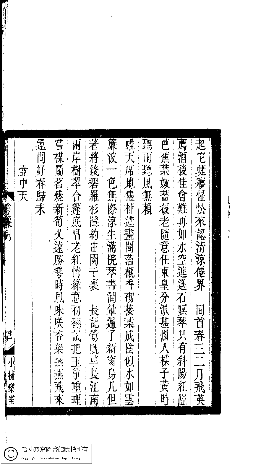 | 疏影 : 綠陰二首和魏雨人明經作 Shu ying : lü yin er shou he Wei Yuren ming jing zuo 詞 ci 吳藻﹐號玉岑子﹐字蘋香﹐又名花簾詞人 Wu Zao, hao: Yucenzi, zi: Pingxiang 小檀欒室彙刻閨秀詞﹕十集一百種一百卷(清徐乃昌輯) 花簾詞﹕一卷 Xiao tan luan shi hui ke gui xiu ci: 10 ji 100 zhong 100 juan (edited by Xu Naichang, Qing dynasty) Hua lian ci: 1 juan, pp. 花簾詞.39b,花簾詞.40a. |