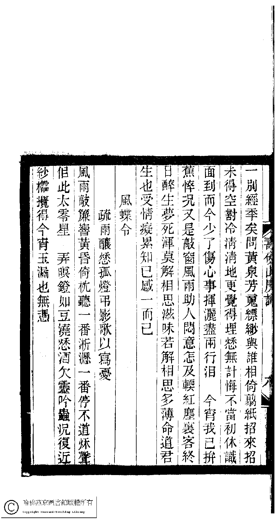 | 金縷曲 : 芝姉周期有感 Jin lü qu : Zhi zi zhou qi you gan 詞 ci 曹景芝﹐字宜仙 Cao Jingzhi, zi: Yixian 小檀欒室彙刻閨秀詞﹕十集一百種一百卷(清徐乃昌輯) 壽研山房詞﹕一卷 Xiao tan luan shi hui ke gui xiu ci: 10 ji 100 zhong 100 juan (edited by Xu Naichang, Qing dynasty) Shou yan shan fang ci: 1 juan, pp. 壽研山房詞.8a,壽研山房詞.8b. |