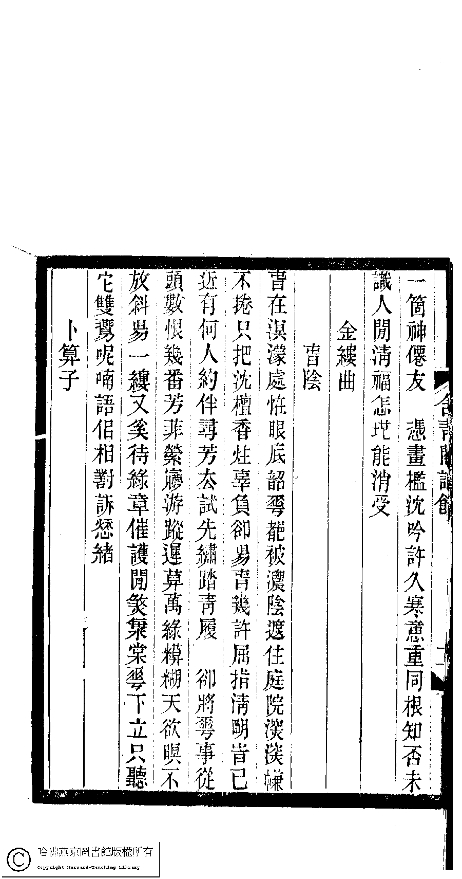| 卜算子 : 龢夫容秌水詞韻 Bu suan zi : He Fu rong qiu shui ci yun 詞 ci 屈蕙纕﹐字逸珊 Qu Huixiang, zi: Yishan 小檀欒室彙刻閨秀詞﹕十集一百種一百卷(清徐乃昌輯) 含青閣詩餘﹕一卷 Xiao tan luan shi hui ke gui xiu ci: 10 ji 100 zhong 100 juan (edited by Xu Naichang, Qing dynasty) Han qing ge shi yu: 1 juan, pp. 含青閣詩餘.2b,含青閣詩餘.3a. |