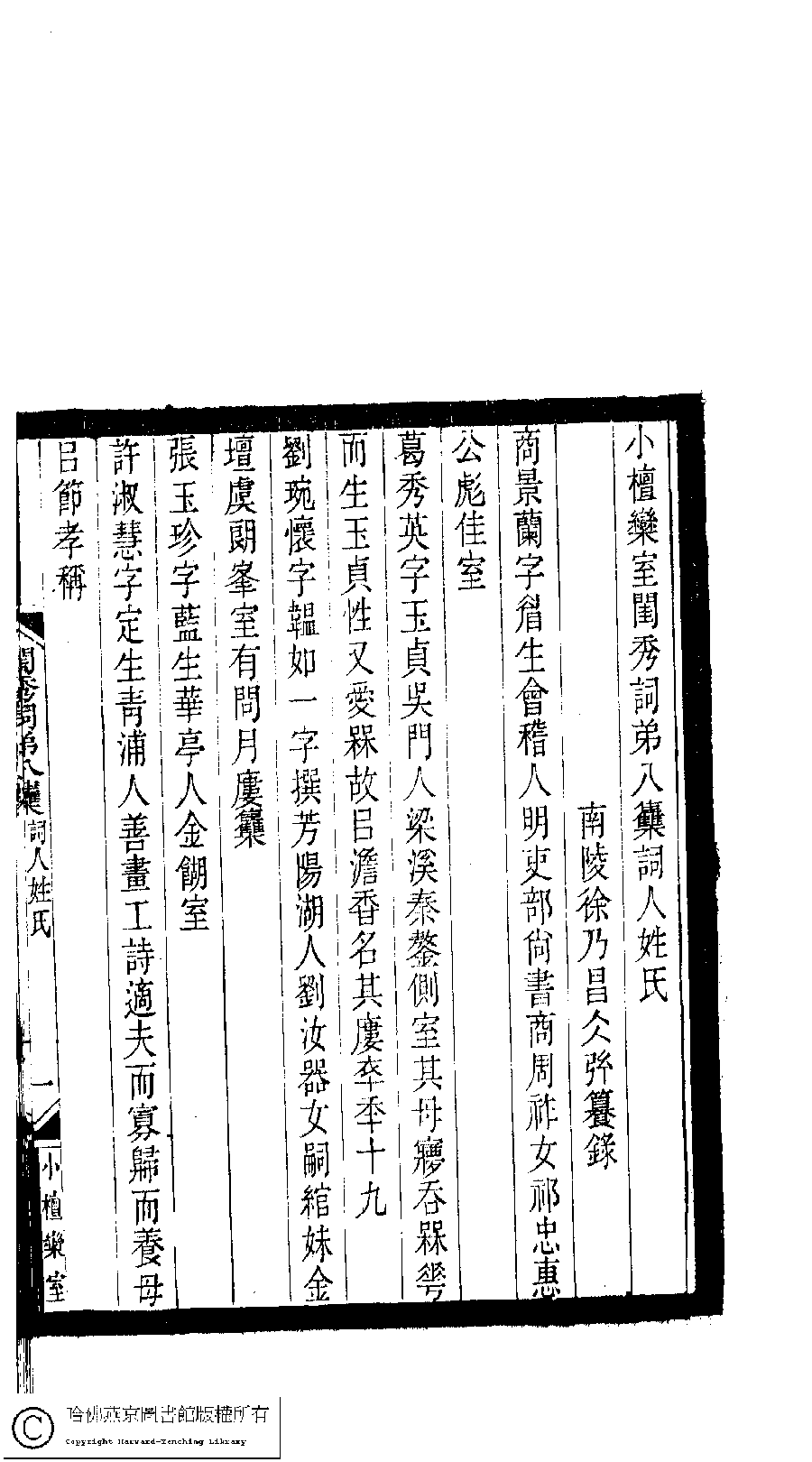 | 小檀欒室閨秀詞第八集詞人姓氏 Xiao tan luan shi gui xiu ci di ba ji ci ren xing shi 徐乃昌﹐號隨庵﹐字積餘 Xu Naichang, hao: Suian, zi: Jiyu 小檀欒室彙刻閨秀詞﹕十集一百種一百卷(清徐乃昌輯) Xiao tan luan shi hui ke gui xiu ci: 10 ji 100 zhong 100 juan (edited by Xu Naichang, Qing dynasty) , pp. 姓氏.1a,姓氏.1b. |