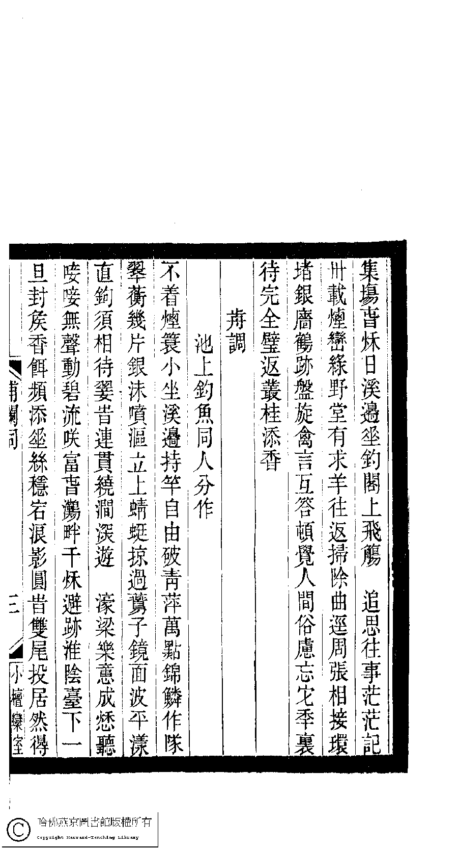 | 前調[浣溪沙] : 池上釣魚同人分作 Qian diao [Huan xi sha] : Chi shang diao yu tong ren fen zuo 詞 ci 劉琬懷﹐號撰芳﹐字韞如 Liu Wanhuai, hao: Zhuanfang, zi: Yunru 小檀欒室彙刻閨秀詞﹕十集一百種一百卷(清徐乃昌輯) 補欄詞﹕一卷 Xiao tan luan shi hui ke gui xiu ci: 10 ji 100 zhong 100 juan (edited by Xu Naichang, Qing dynasty) Bu lan ci: 1 juan, pp. 補欄詞.3a,補欄詞.3b. |
