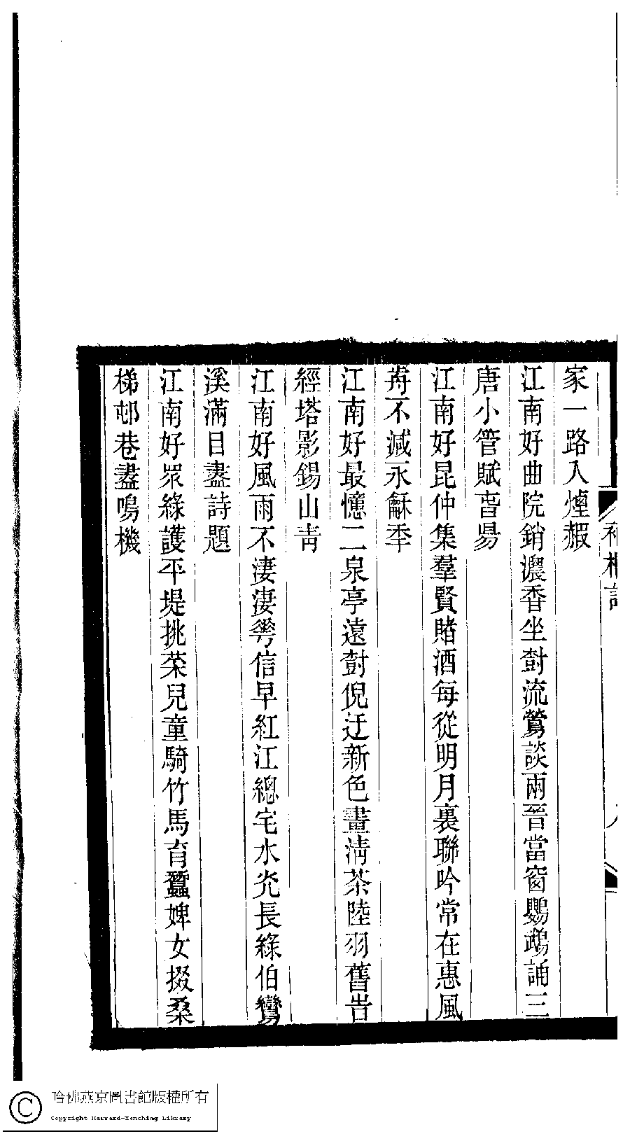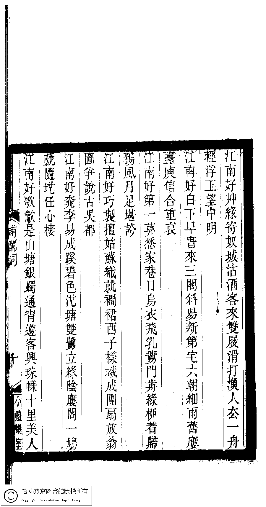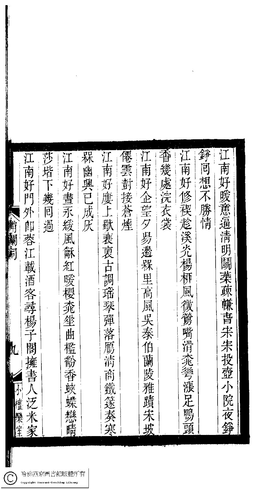 | 望江南 : 雜詠 Wang jiang nan : Za yong 詞 ci 劉琬懷﹐號撰芳﹐字韞如 Liu Wanhuai, hao: Zhuanfang, zi: Yunru 小檀欒室彙刻閨秀詞﹕十集一百種一百卷(清徐乃昌輯) 補欄詞﹕一卷 Xiao tan luan shi hui ke gui xiu ci: 10 ji 100 zhong 100 juan (edited by Xu Naichang, Qing dynasty) Bu lan ci: 1 juan, pp. 補欄詞.10a,補欄詞.10b,補欄詞.8a,補欄詞.8b,補欄詞.9a,補欄詞.9b. |