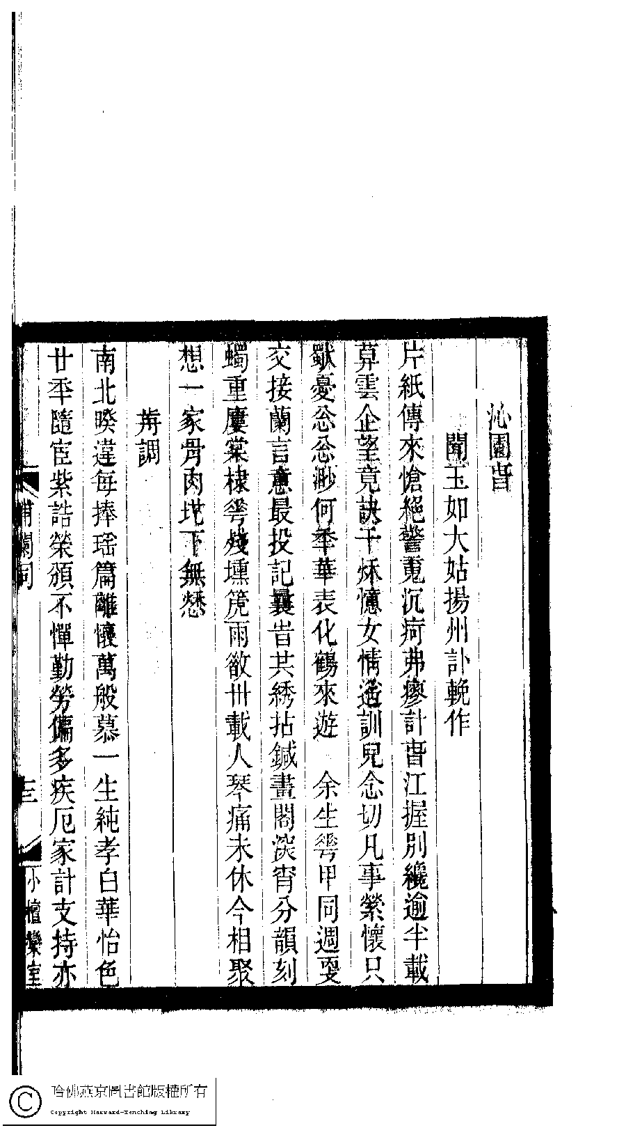 | 前調[沁園春] Qian diao[Qin yuan chun] 詞 ci 劉琬懷﹐號撰芳﹐字韞如 Liu Wanhuai, hao: Zhuanfang, zi: Yunru 小檀欒室彙刻閨秀詞﹕十集一百種一百卷(清徐乃昌輯) 補欄詞﹕一卷 Xiao tan luan shi hui ke gui xiu ci: 10 ji 100 zhong 100 juan (edited by Xu Naichang, Qing dynasty) Bu lan ci: 1 juan, pp. 補欄詞.13a,補欄詞.13b. |