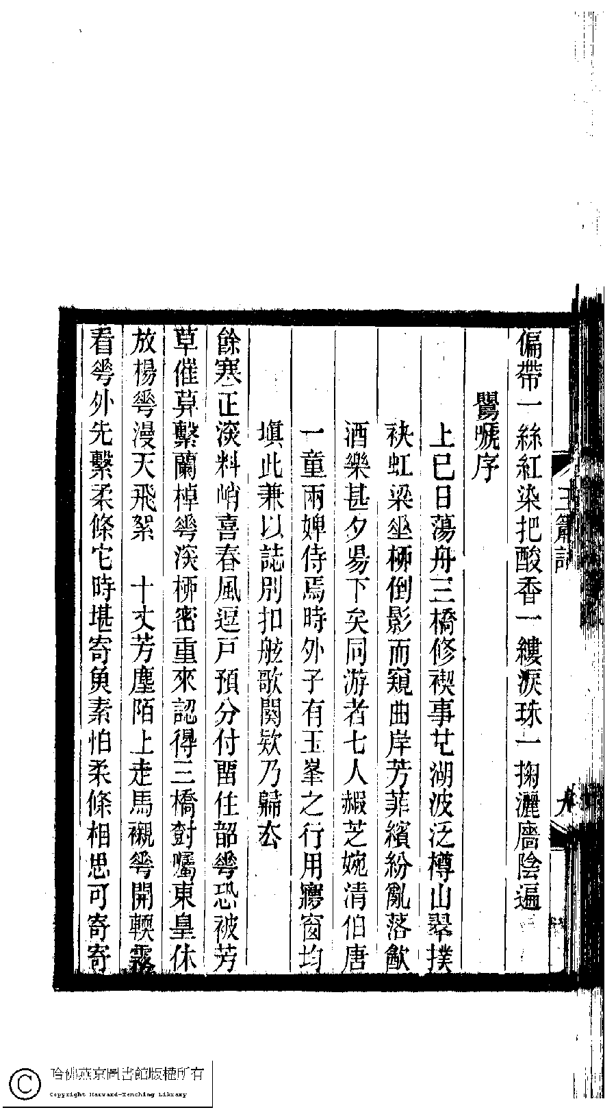 | 前調[水龍吟] : 白秋海棠 Qian diao [Shui long yin] : Bai qiu hai tang 詞 ci 殷秉璣﹐字莖僊 Yin Bingji, zi: Jingxian 小檀欒室彙刻閨秀詞﹕十集一百種一百卷(清徐乃昌輯) 玉簫詞﹕一卷 Xiao tan luan shi hui ke gui xiu ci: 10 ji 100 zhong 100 juan (edited by Xu Naichang, Qing dynasty) Yu xiao ci: 1 juan, pp. 玉簫詞.9a,玉簫詞.9b. |