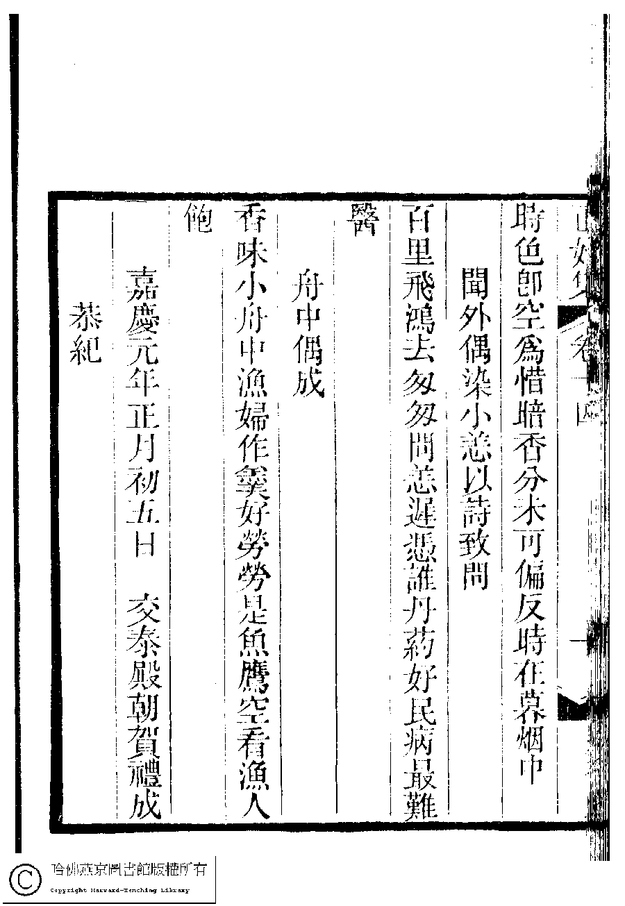 | 舟中偶成 Zhou zhong ou cheng 詩 - 五言絕句 shi - wuyanjueju 瑩川﹐字如亭 Yingchuan, zi: Ruting 國朝閨秀正始集﹕二十卷﹐附錄﹕一卷﹐補遺﹕一卷﹐又附題詞﹕一卷(清惲珠輯) Guo chao gui xiu zheng shi ji: 20 juan, fu lu: 1 juan, bu yi: 1 juan, you fu ti ci: 1 juan (edited by Yun Zhu, Qing dynasty) , pp. 14.1b. |