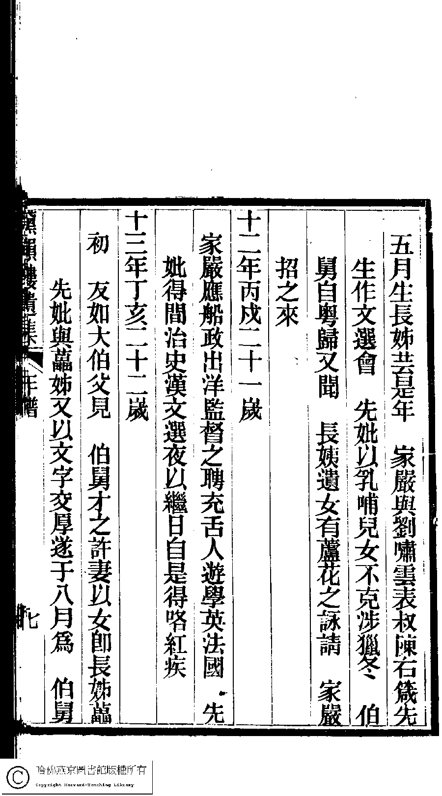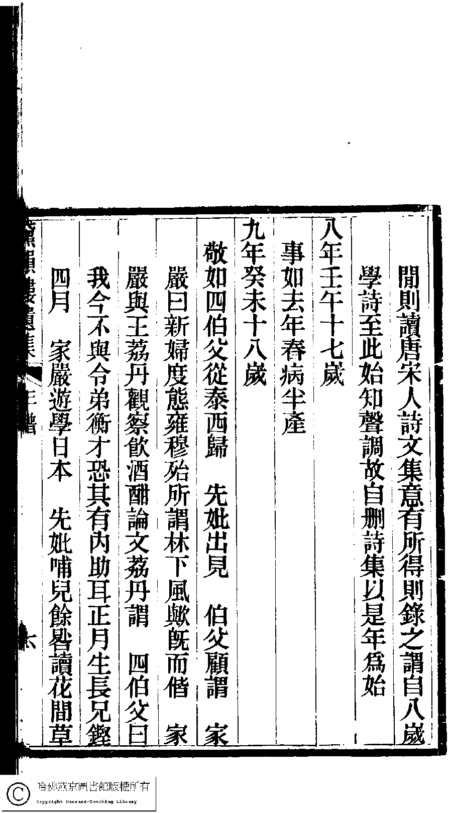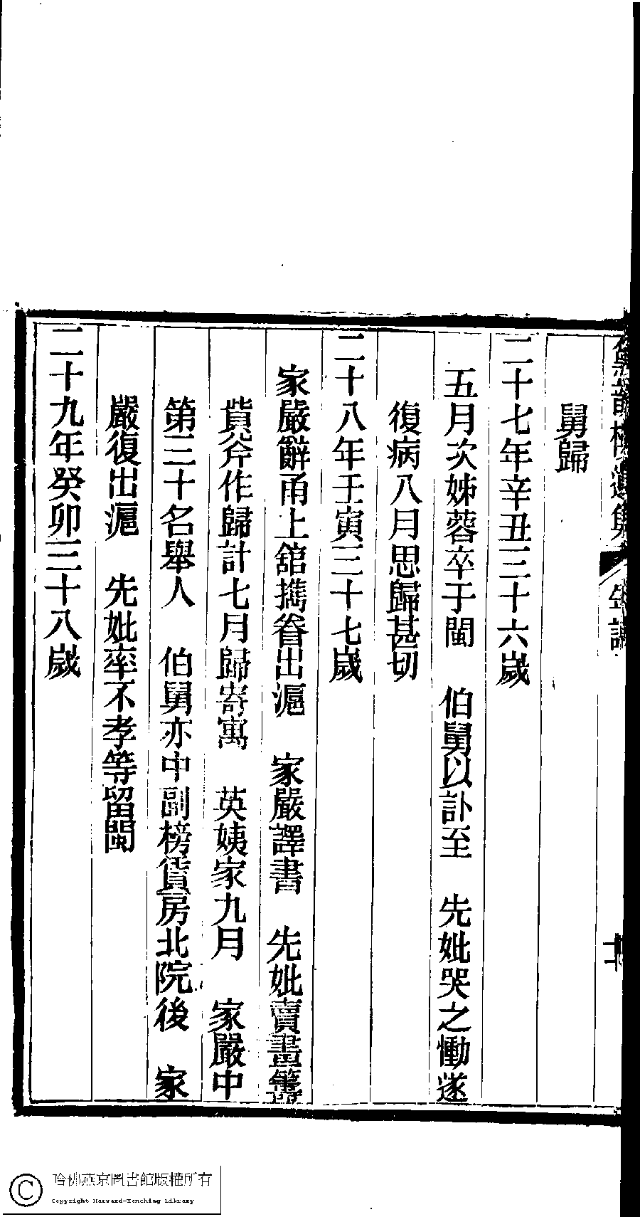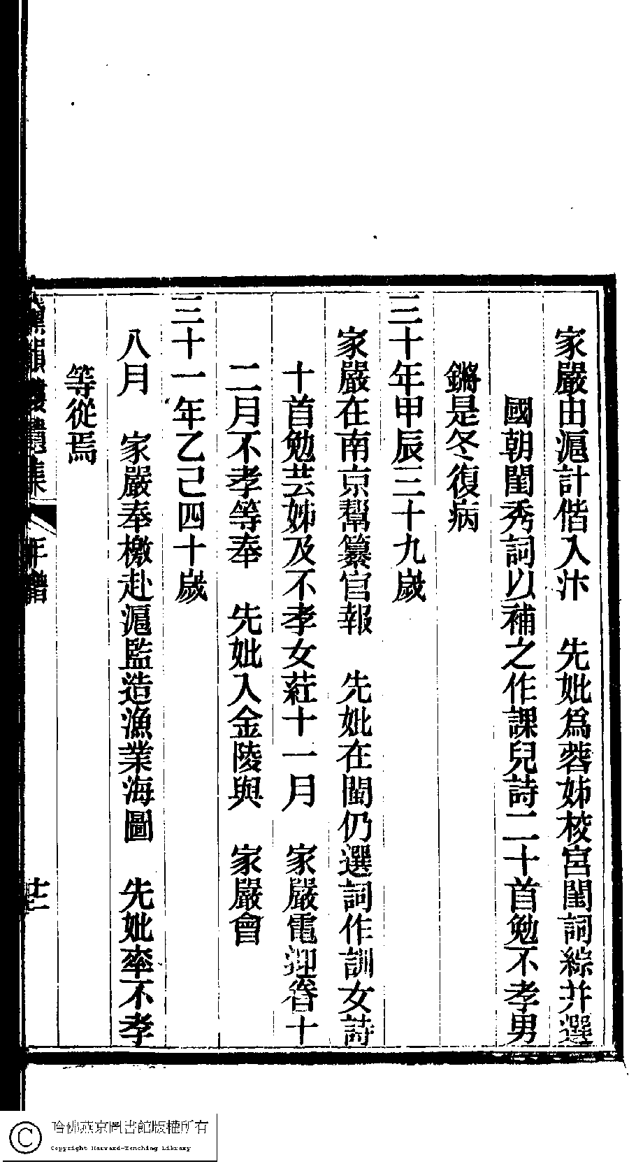 | 先妣薛恭人年譜 Xian pi Xue gong ren nian pu 文﹕年譜 Wen: Nian pu 陳鏘 Chen Qiang 陳瑩 Chen Ying 陳葒 Chen Hong 黛韻樓遺集(清薛紹徽撰) Dai yun lou shi wen ji (by Xue Shaohui, Qing dynasty) , pp. 年譜.10a,年譜.10b,年譜.11a,年譜.11b,年譜.12a,年譜.12b,年譜.13a,年譜.13b,年譜.14a,年譜.14b,年譜.1a,年譜.1b,年譜.2a,年譜.2b,年譜.3a,年譜.3b,年譜.4a,年譜.4b,年譜.5a,年譜.5b,年譜.6a,年譜.6b,年譜.7a,年譜.7b,年譜.8a,年譜.8b,年譜.9a,年譜.9b. |
