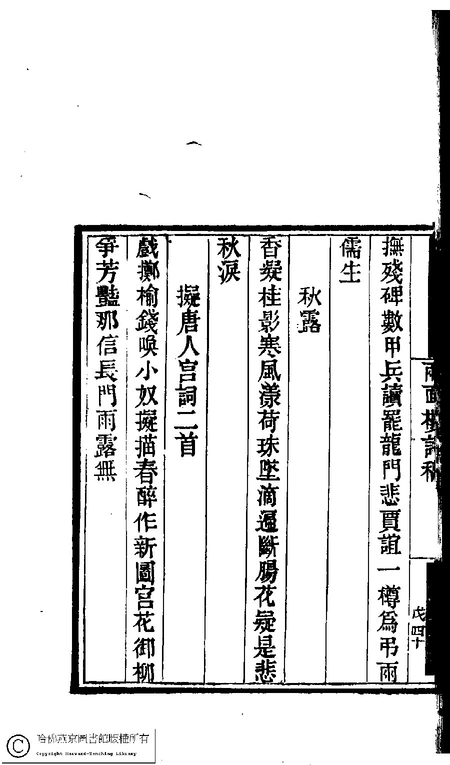 國朝閨閣詩鈔﹕一百種一百卷(清蔡殿齊輯) 兩面樓詩稿﹕一卷 Guo chao gui ge shi chao: 100 zhong 100 juan (edited by Cai Dianqi, Qing dynasty) Liang mian lou shi gao: 1 juan, pp. 5.40b.