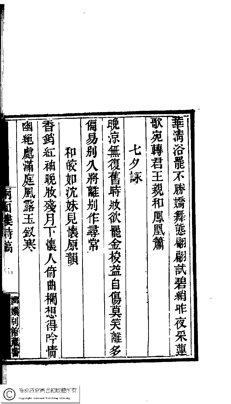 | 和皎如沈妹見懷原韻 He Jiaoru Shen mei jian huai yuan yun 詩 - 七言絕句 shi - qiyanjueju 張芬﹐字紫蘩﹐又名月樓 Zhang Fen, zi: Zifan 國朝閨閣詩鈔﹕一百種一百卷(清蔡殿齊輯) 兩面樓詩稿﹕一卷 Guo chao gui ge shi chao: 100 zhong 100 juan (edited by Cai Dianqi, Qing dynasty) Liang mian lou shi gao: 1 juan, pp. 5.41a. |