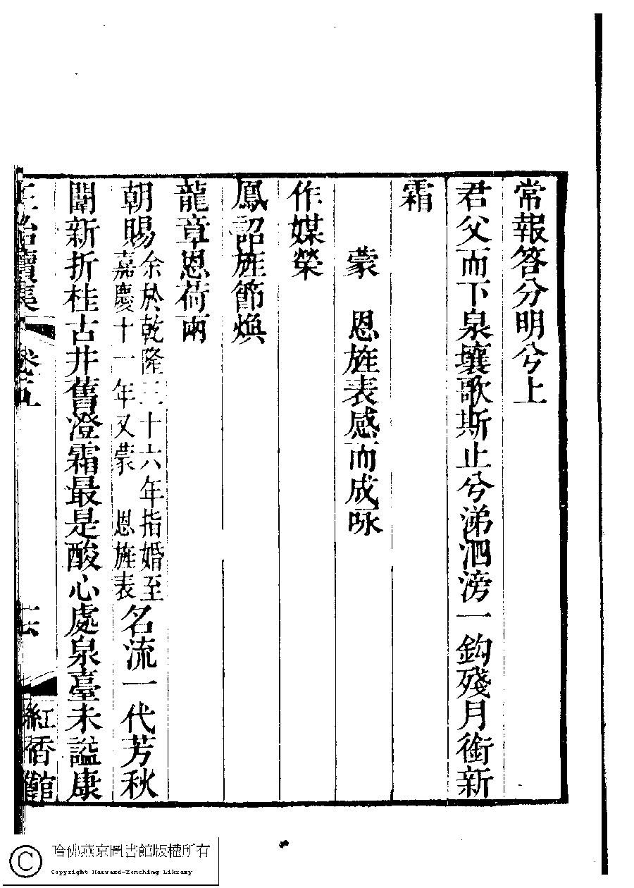 | 霜淚吟 Shuang lei yin 詩 - 樂府 shi - yuefu 夢月﹐號四焉主人 Mengyue, hao: Siyanzhuren 國朝閨秀正始續集﹕十卷﹐附錄﹕一卷﹐補遺﹕一卷﹐輓詞﹕一卷(清惲珠輯) Guo chao gui xiu zheng shi xu ji: 10 juan, fu lu: 1 juan, bu yi: 1 juan, wan ci: 1 juan (edited by Yun Zhu, Qing dynasty) , pp. 5.15a,5.15b,5.16a. |