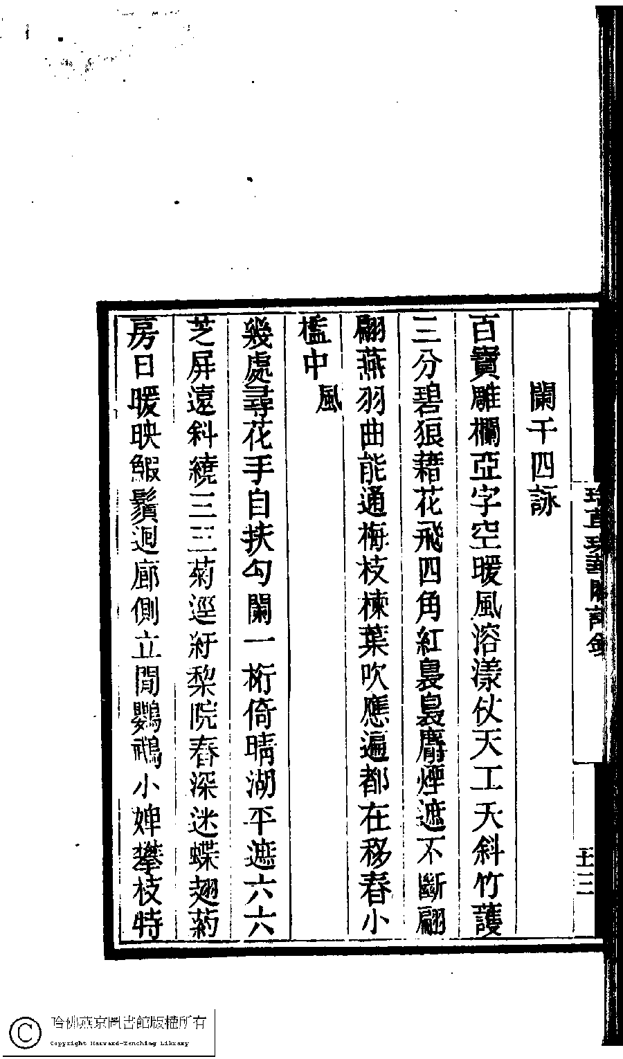 | 闌干四詠 Lan gan si yong 詩 - 七言律詩 shi - qiyanlüshi 席慧文﹐號印蒼﹐字怡珊 Xi Huiwen, hao: Yincang, zi: Yishan 國朝閨閣詩鈔﹕一百種一百卷(清蔡殿齊輯) 瑤草珠華閣詩鈔﹕一卷 Guo chao gui ge shi chao: 100 zhong 100 juan (edited by Cai Dianqi, Qing dynasty) Yao cao zhu hua ge shi chao: 1 juan, pp. 9.3b,9.4a,9.4b. |