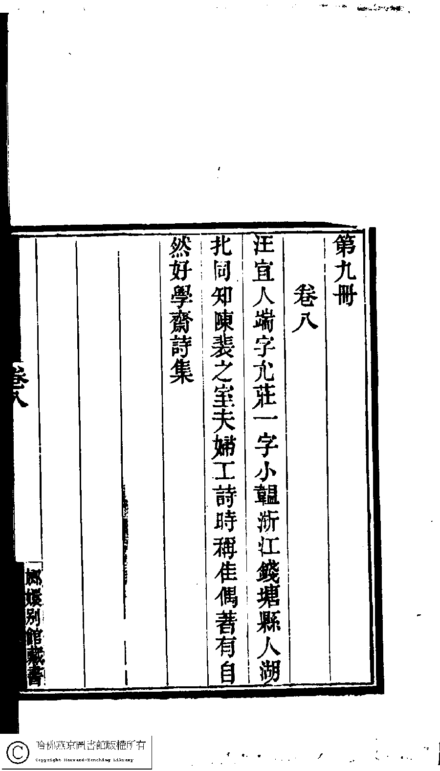 | 汪端[略傳] Wang Duan [lüe zhuan] 文﹕略傳 Wen: lue zhuan 甘晉﹐字仲湟﹐又名子大﹐鶴樵 Gan Jin, zi: Zhonghuang 國朝閨閣詩鈔﹕一百種一百卷(清蔡殿齊輯) 自然好學齋詩集﹕一卷 Guo chao gui ge shi chao: 100 zhong 100 juan (edited by Cai Dianqi, Qing dynasty) Zi ran hao xue zhai shi ji: 1 juan, pp. 9.38a,9.38b. |