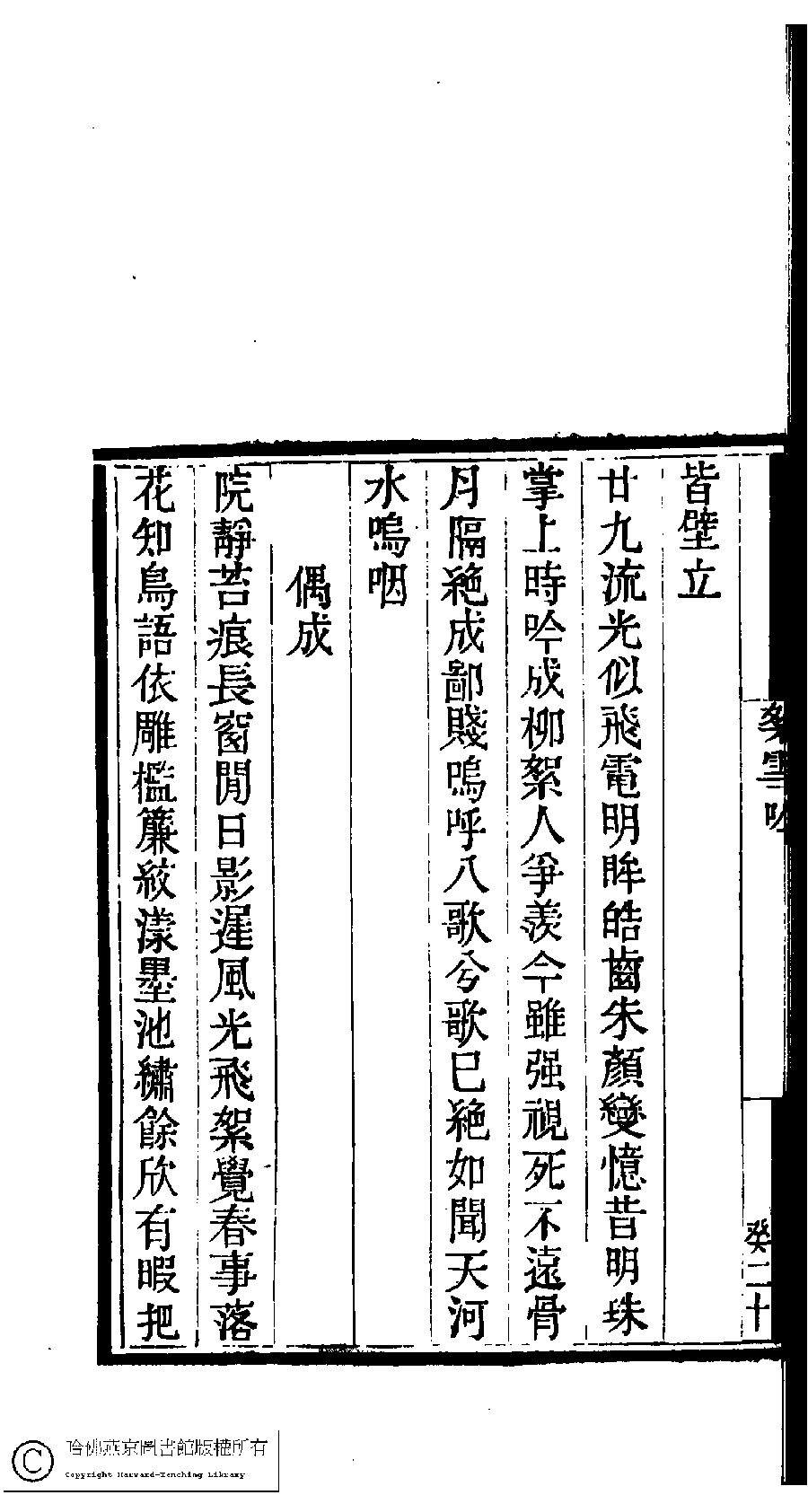 | 冬日作短歌八首倣少陵體 Dong ri zuo duan ge ba shou fang Shaoling ti 詩 - 七言古詩 shi - qiyangushi 朱景素﹐字菊如﹐又名淡如 Zhu Jingsu, zi: Juru 國朝閨閣詩鈔﹕一百種一百卷(清蔡殿齊輯) 絮雪吟﹕一卷 Guo chao gui ge shi chao: 100 zhong 100 juan (edited by Cai Dianqi, Qing dynasty) Xu xue yin: 1 juan, pp. 10.18b,10.19a,10.19b,10.20a,10.20b. |