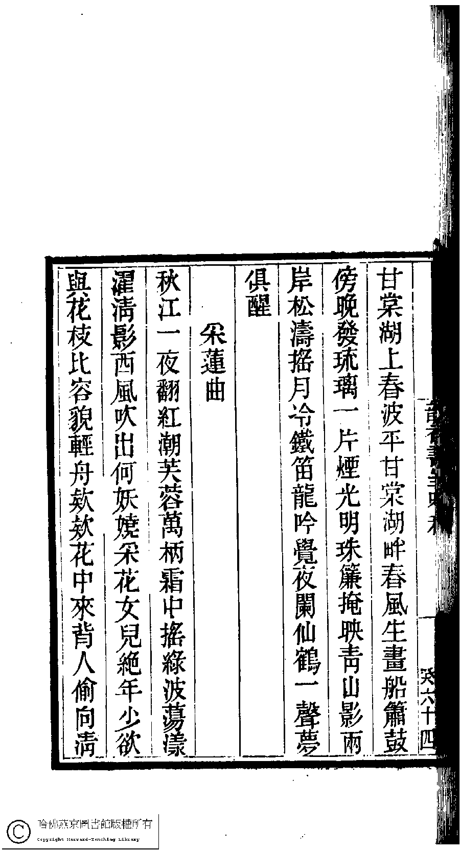 | 春遊曲 Chun you qu 詩 - 七言古詩 shi - qiyangushi 萬夢丹﹐號品菊﹐字篆卿 Wan Mengdan, hao: Pinju, zi: Zhuanqing 國朝閨閣詩鈔﹕一百種一百卷(清蔡殿齊輯) 韻香書室吟稿﹕一卷 Guo chao gui ge shi chao: 100 zhong 100 juan (edited by Cai Dianqi, Qing dynasty) Yun xiang shu shi yin gao: 1 juan, pp. 10.64a,10.64b. |
