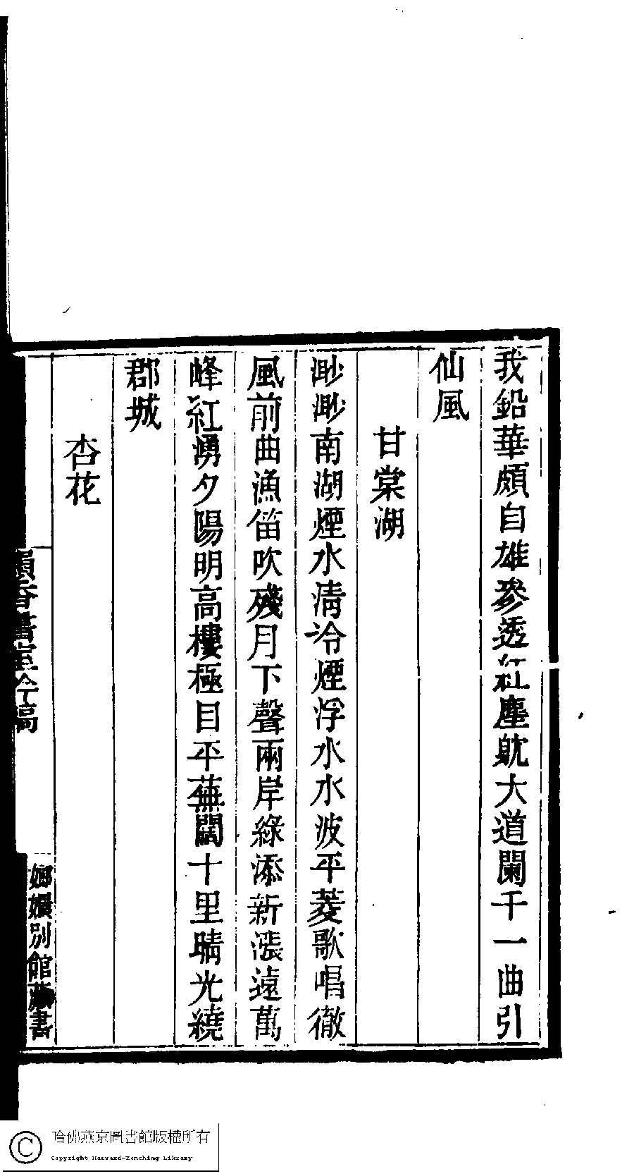 | 甘棠湖 Gantang Hu 詩 - 七言律詩 shi - qiyanlüshi 萬夢丹﹐號品菊﹐字篆卿 Wan Mengdan, hao: Pinju, zi: Zhuanqing 國朝閨閣詩鈔﹕一百種一百卷(清蔡殿齊輯) 韻香書室吟稿﹕一卷 Guo chao gui ge shi chao: 100 zhong 100 juan (edited by Cai Dianqi, Qing dynasty) Yun xiang shu shi yin gao: 1 juan, pp. 10.73a. |