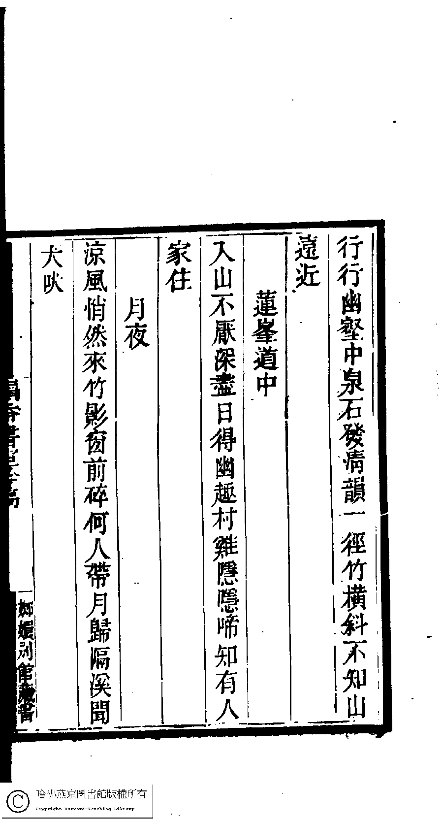 | 蓮峯道中 Lian feng dao zhong 詩 - 五言古詩 shi - wuyangushi 萬夢丹﹐號品菊﹐字篆卿 Wan Mengdan, hao: Pinju, zi: Zhuanqing 國朝閨閣詩鈔﹕一百種一百卷(清蔡殿齊輯) 韻香書室吟稿﹕一卷 Guo chao gui ge shi chao: 100 zhong 100 juan (edited by Cai Dianqi, Qing dynasty) Yun xiang shu shi yin gao: 1 juan, pp. 10.74a. |
