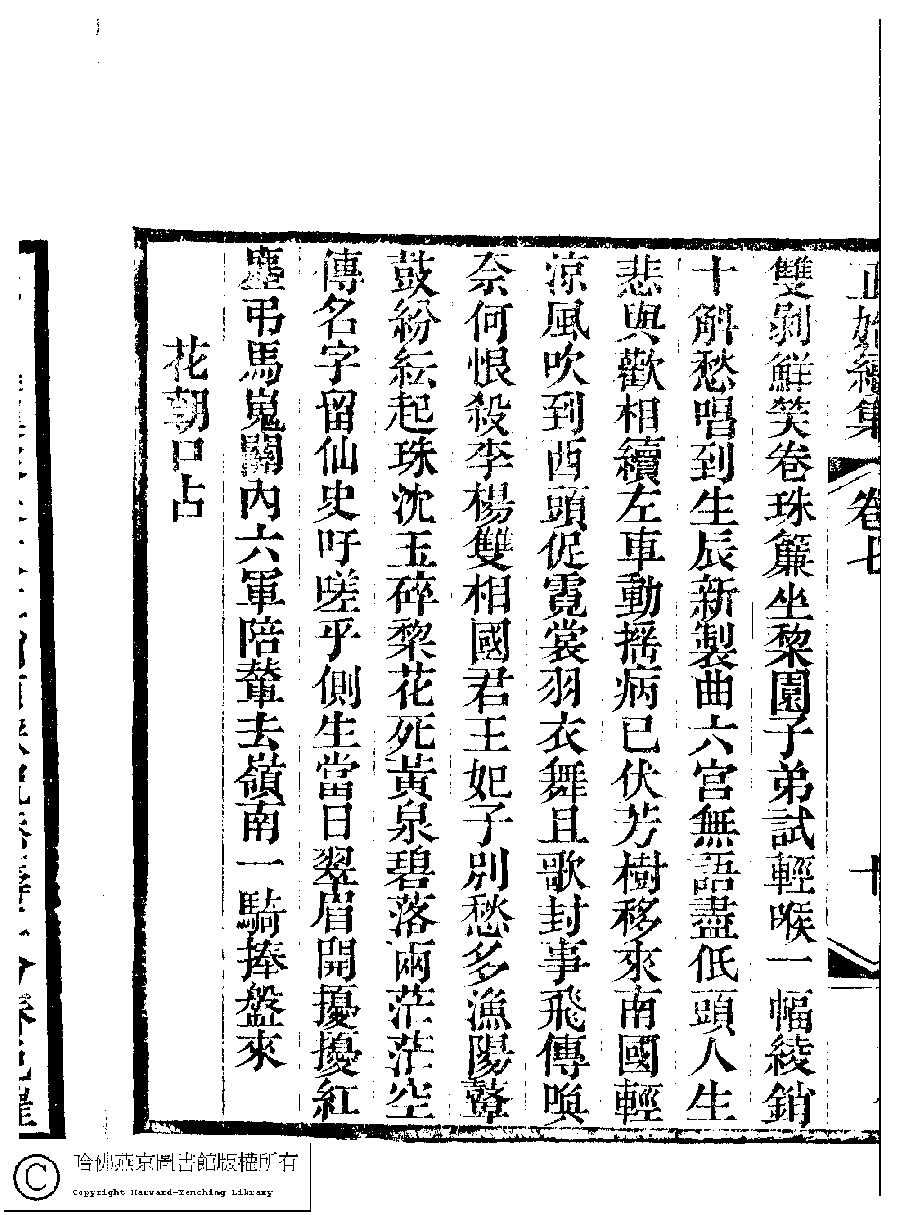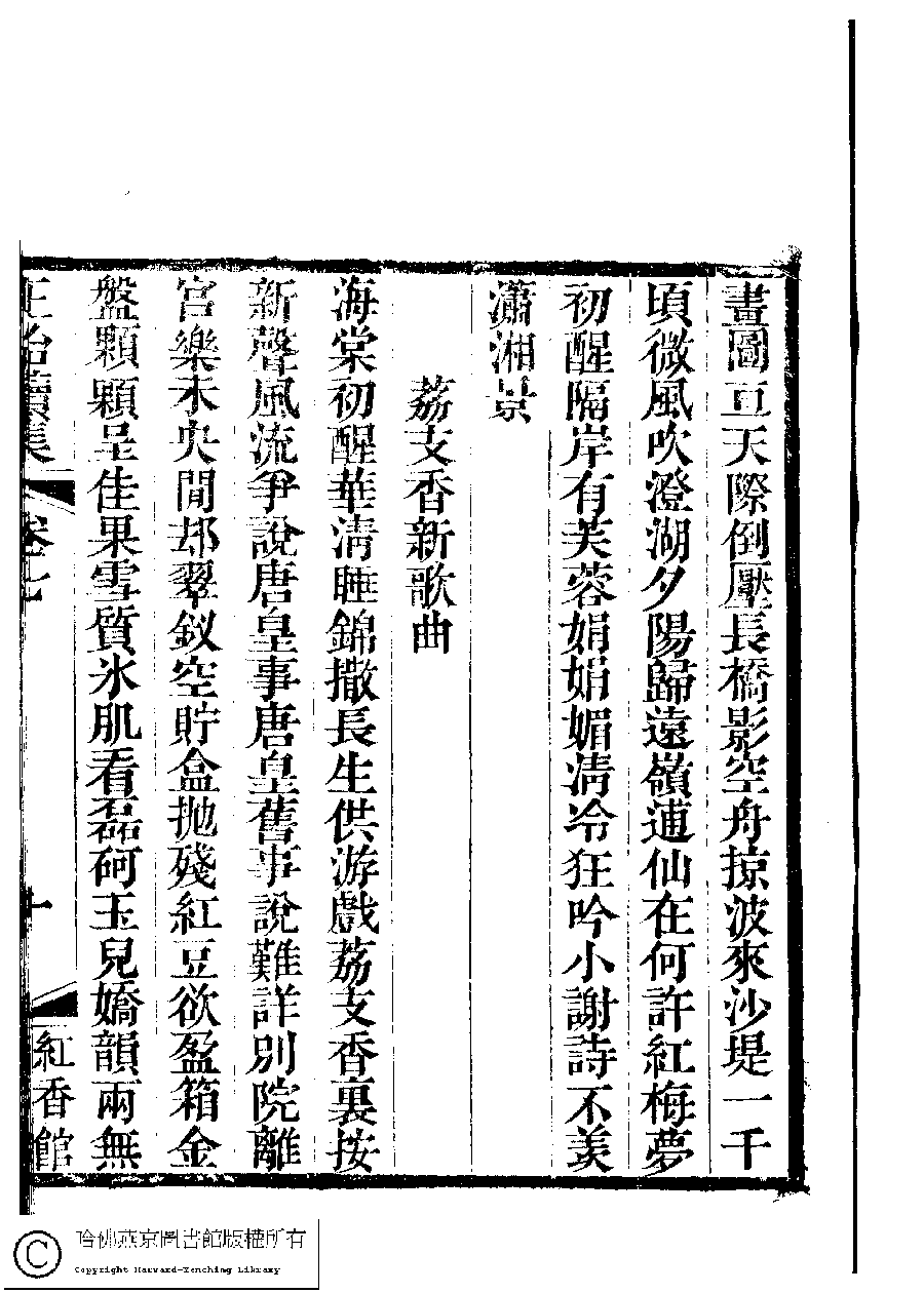 | 荔支香新歌曲 Li zhi xiang xin ge qu 詩 - 樂府 shi - yuefu 鎖瑞芝﹐字佩芬 Suo Ruizhi, zi: Peifen 國朝閨秀正始續集﹕十卷﹐附錄﹕一卷﹐補遺﹕一卷﹐輓詞﹕一卷(清惲珠輯) Guo chao gui xiu zheng shi xu ji: 10 juan, fu lu: 1 juan, bu yi: 1 juan, wan ci: 1 juan (edited by Yun Zhu, Qing dynasty) , pp. 7.10a,7.10b. |