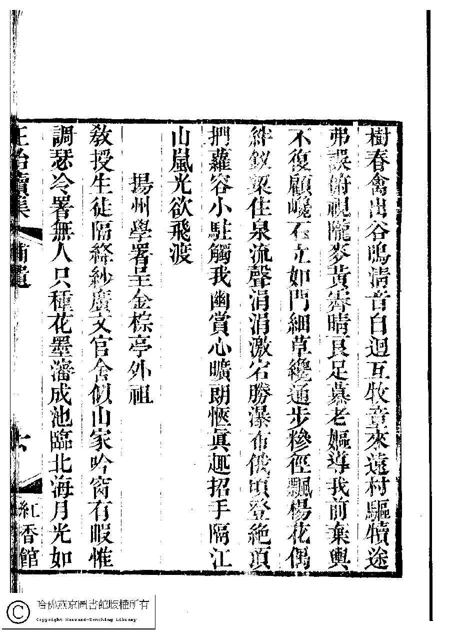 | 揚州學署呈金棕亭外祖 Yangzhou xue shu cheng Jin Zongting wai zu 詩 - 七言律詩 shi - qiyanlüshi 胡恩榮 Hu Enrong 國朝閨秀正始續集﹕十卷﹐附錄﹕一卷﹐補遺﹕一卷﹐輓詞﹕一卷(清惲珠輯) Guo chao gui xiu zheng shi xu ji: 10 juan, fu lu: 1 juan, bu yi: 1 juan, wan ci: 1 juan (edited by Yun Zhu, Qing dynasty) , pp. 補遺.6a,補遺.6b. |