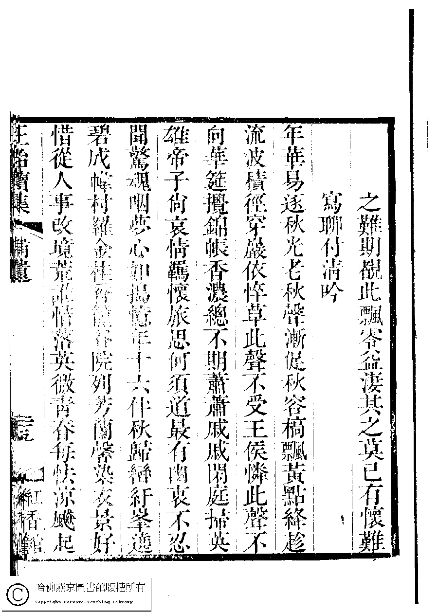 | 落葉吟(有引) Luo ye yin 詩 - 七言古詩 shi - qiyangushi 葉舫﹐字梅語 Ye Fang, zi: Meiyu 國朝閨秀正始續集﹕十卷﹐附錄﹕一卷﹐補遺﹕一卷﹐輓詞﹕一卷(清惲珠輯) Guo chao gui xiu zheng shi xu ji: 10 juan, fu lu: 1 juan, bu yi: 1 juan, wan ci: 1 juan (edited by Yun Zhu, Qing dynasty) , pp. 補遺.24b,補遺.25a,補遺.25b. |