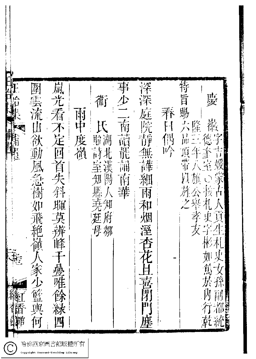 | 慶徽[略傳] Qinghui [lüe zhuan] 文﹕略傳 Wen: lue zhuan 惲珠﹐號星聯﹐字珍浦﹐又名完顏惲珠, 蓉湖道人, 蓉湖女史, 蓉湖散人, 毗陵女史 Yun Zhu, hao: Xinglian, zi: Zhenpu 國朝閨秀正始集﹕二十卷﹐附錄﹕一卷﹐補遺﹕一卷﹐又附題詞﹕一卷(清惲珠輯) Guo chao gui xiu zheng shi ji: 20 juan, fu lu: 1 juan, bu yi: 1 juan, you fu ti ci: 1 juan (edited by Yun Zhu, Qing dynasty) , pp. 補遺.23a. |