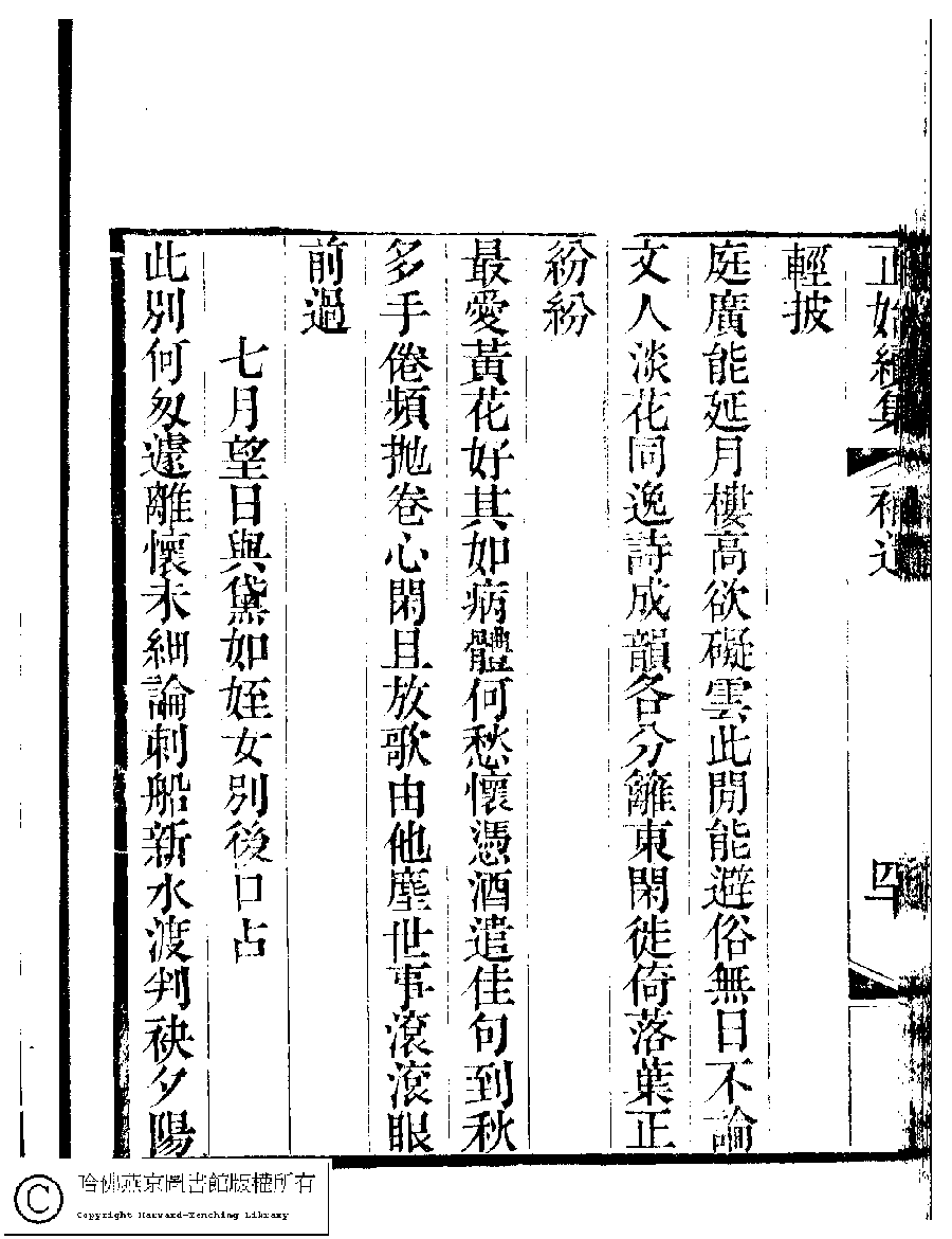 | 七月望日與黛如姪女別後口占 Qi yue wang ri yu Dairu zhi nü bie hou kou zhan 詩 - 五言律詩 shi - wuyanlüshi 方筠﹐號雪廬﹐字蘭畦 Fang Yun, hao: Xuelu, zi: Lanqi 國朝閨秀正始續集﹕十卷﹐附錄﹕一卷﹐補遺﹕一卷﹐輓詞﹕一卷(清惲珠輯) Guo chao gui xiu zheng shi xu ji: 10 juan, fu lu: 1 juan, bu yi: 1 juan, wan ci: 1 juan (edited by Yun Zhu, Qing dynasty) , pp. 補遺.40b,補遺.41a. |