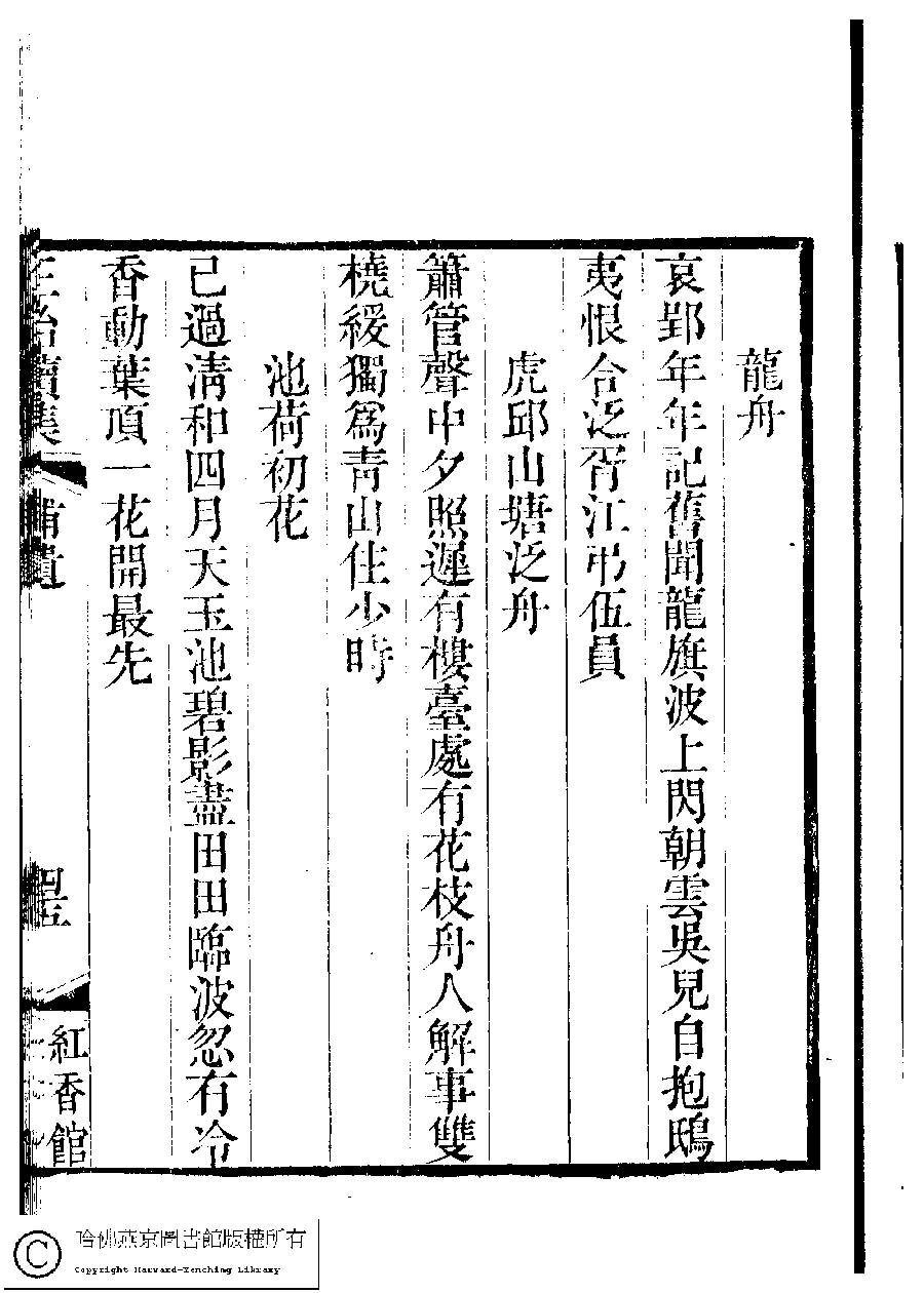 | 池荷初花 Chi he chu hua 詩 - 七言絕句 shi - qiyanjueju 董國容﹐號靈瓊﹐字綺琴 Dong Guorong, hao: Lingqiong, zi: Qiqin 國朝閨秀正始續集﹕十卷﹐附錄﹕一卷﹐補遺﹕一卷﹐輓詞﹕一卷(清惲珠輯) Guo chao gui xiu zheng shi xu ji: 10 juan, fu lu: 1 juan, bu yi: 1 juan, wan ci: 1 juan (edited by Yun Zhu, Qing dynasty) , pp. 補遺.45a. |