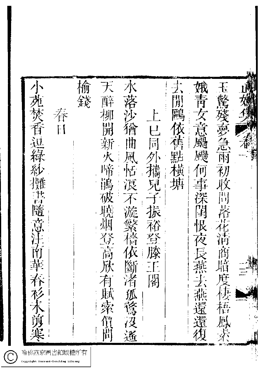 | 春日 Chun ri 詩 - 七言律詩 shi - qiyanlüshi 朱中楣﹐字遠山﹐又名懿則 Zhu Zhongmei, zi: Yuanshan 國朝閨秀正始集﹕二十卷﹐附錄﹕一卷﹐補遺﹕一卷﹐又附題詞﹕一卷(清惲珠輯) Guo chao gui xiu zheng shi ji: 20 juan, fu lu: 1 juan, bu yi: 1 juan, you fu ti ci: 1 juan (edited by Yun Zhu, Qing dynasty) , pp. 1.13b,1.14a. |