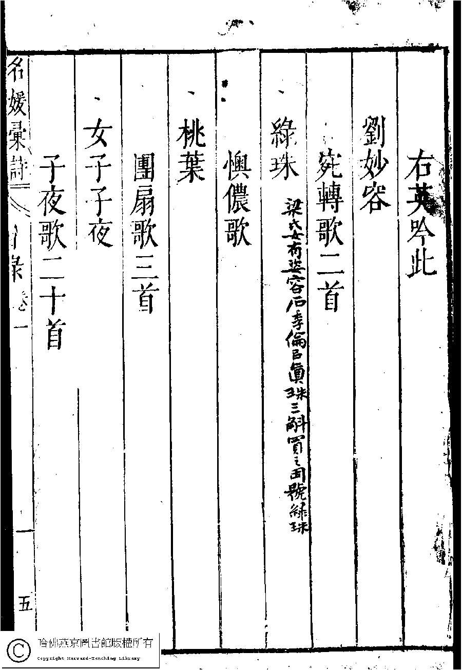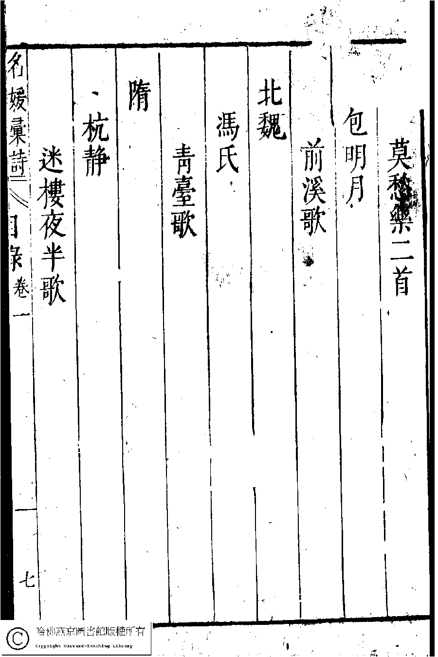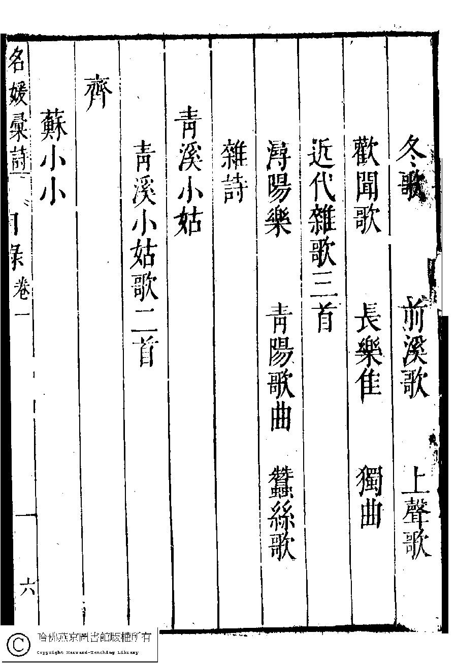 | 名媛彙詩第一卷目錄(古歌) Ming yuan hui shi di yi juan mu lu (Gu ge) 名媛彙詩﹕二十卷(明鄭文昂編) Ming yuan hui shi: 20 juan (by Zheng Wenang, Ming dynasty) , pp. 1.目錄.1a,1.目錄.1b,1.目錄.2a,1.目錄.2b,1.目錄.3a,1.目錄.3b,1.目錄.4a,1.目錄.4b,1.目錄.5a,1.目錄.5b,1.目錄.6a,1.目錄.6b,1.目錄.7a,1.目錄.7b. |