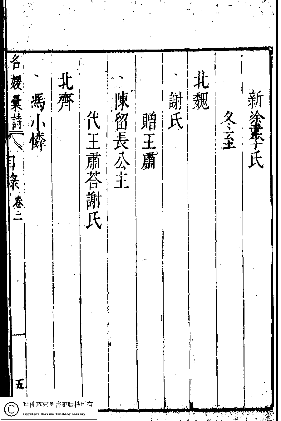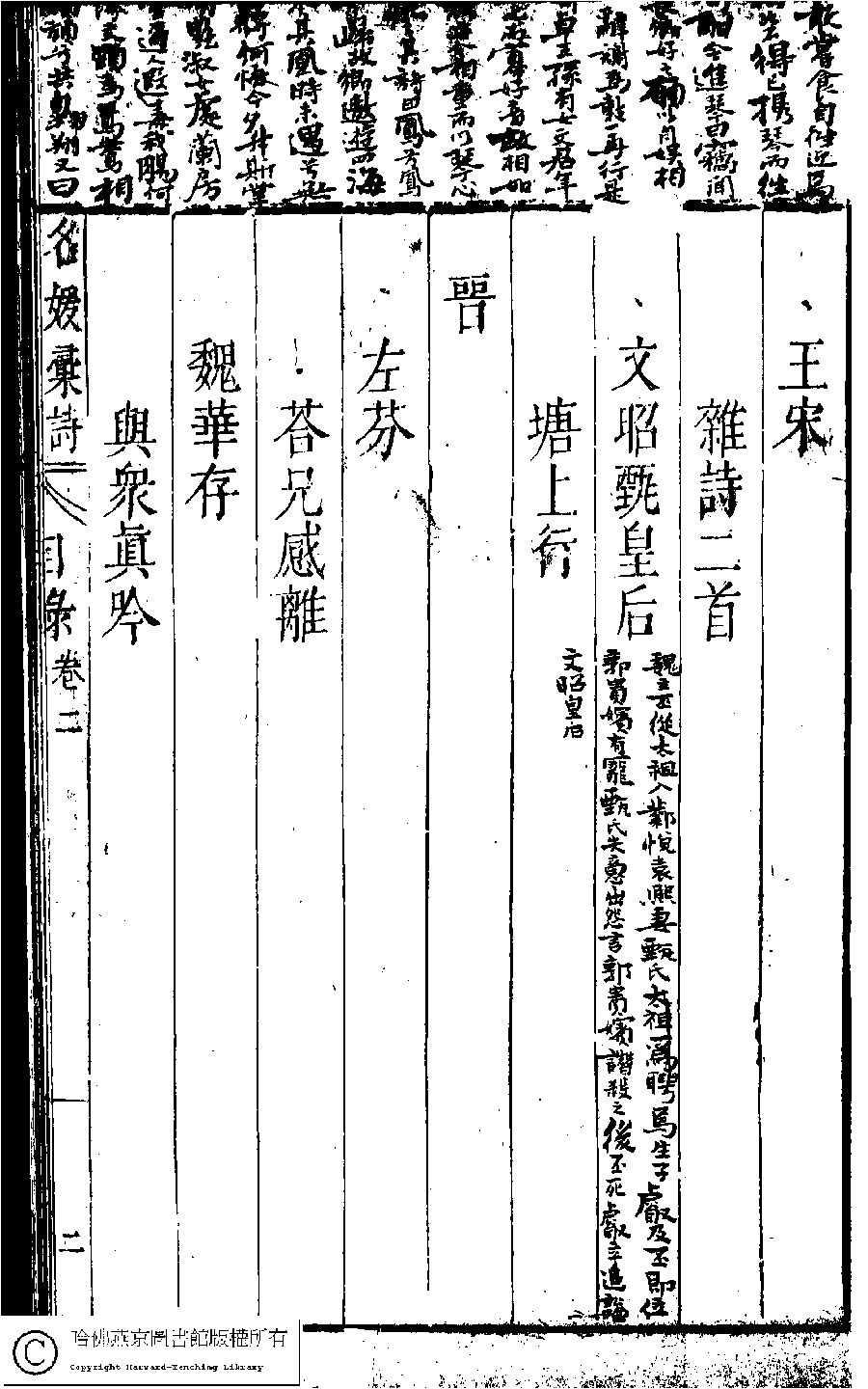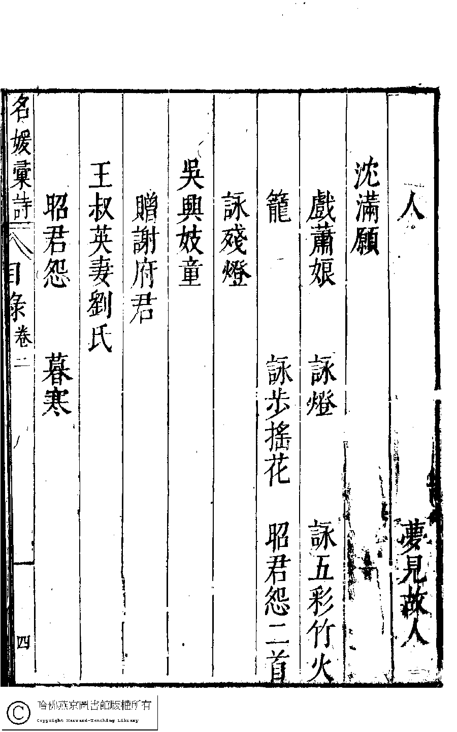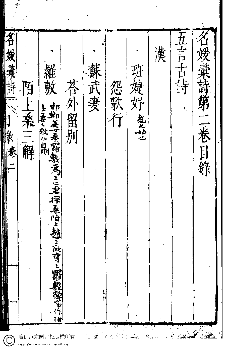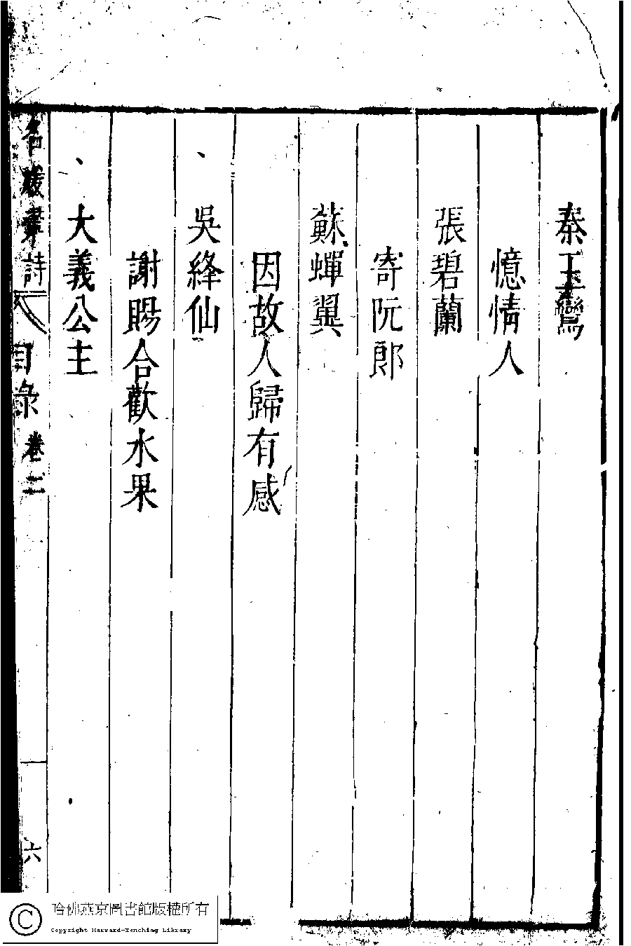 | 名媛彙詩第二卷目錄(五言古詩) Ming yuan hui shi di er juan mu lu (Wu yan gu shi) 詩 shi 名媛彙詩﹕二十卷(明鄭文昂編) Ming yuan hui shi: 20 juan (by Zheng Wenang, Ming dynasty) , pp. 2.目錄.1a,2.目錄.1b,2.目錄.2a,2.目錄.2b,2.目錄.3a,2.目錄.3b,2.目錄.4a,2.目錄.4b,2.目錄.5a,2.目錄.5b,2.目錄.6a,2.目錄.6b. |