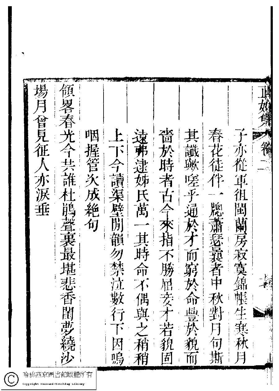 | 和白曉月題壁韻(并引) He Bai Xiaoyue ti bi yun (bing yin) 詩 - 七言絕句 shi - qiyanjueju 碩塔哈 Shuotaha 國朝閨秀正始集﹕二十卷﹐附錄﹕一卷﹐補遺﹕一卷﹐又附題詞﹕一卷(清惲珠輯) Guo chao gui xiu zheng shi ji: 20 juan, fu lu: 1 juan, bu yi: 1 juan, you fu ti ci: 1 juan (edited by Yun Zhu, Qing dynasty) , pp. 2.17a,2.17b. |