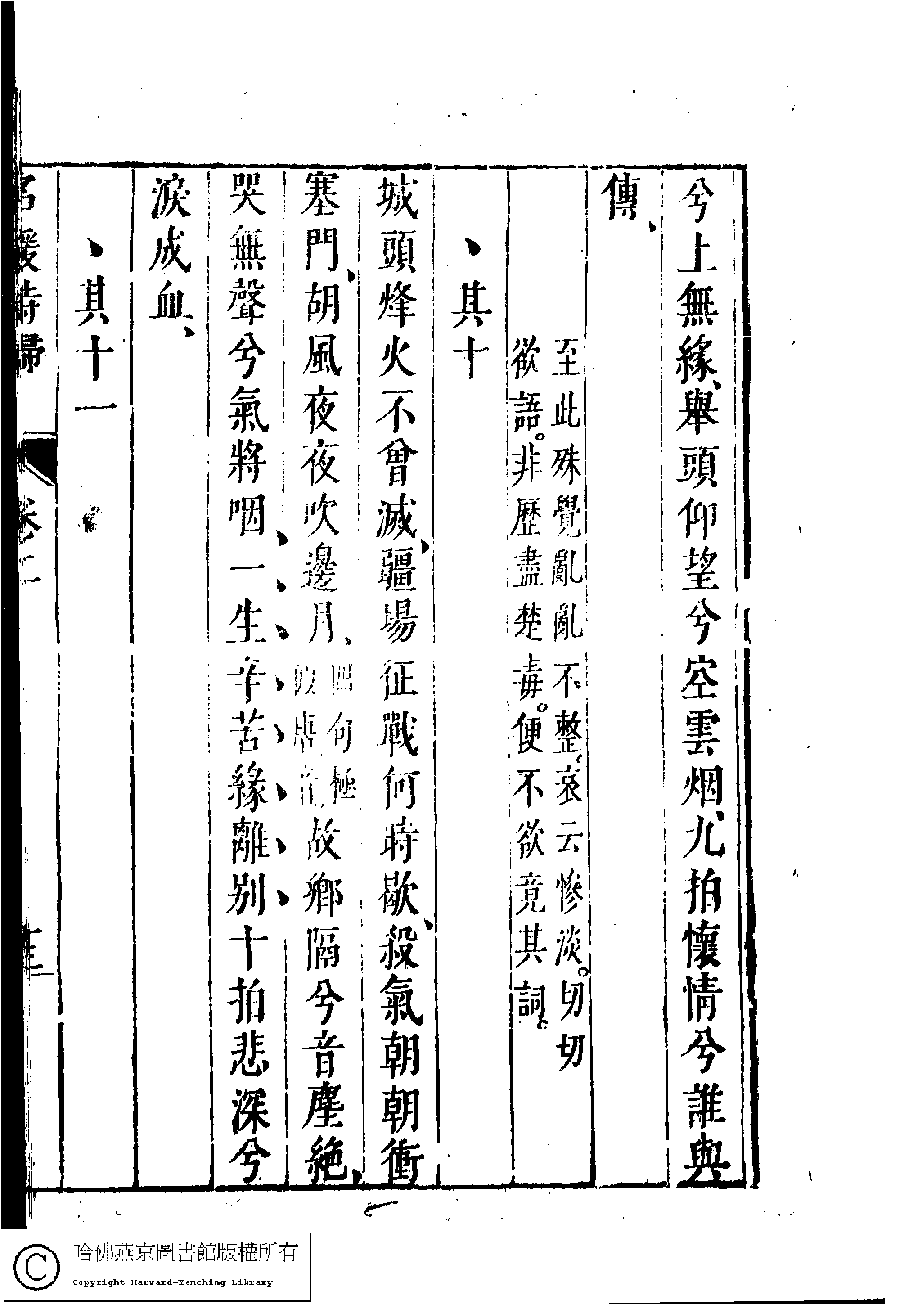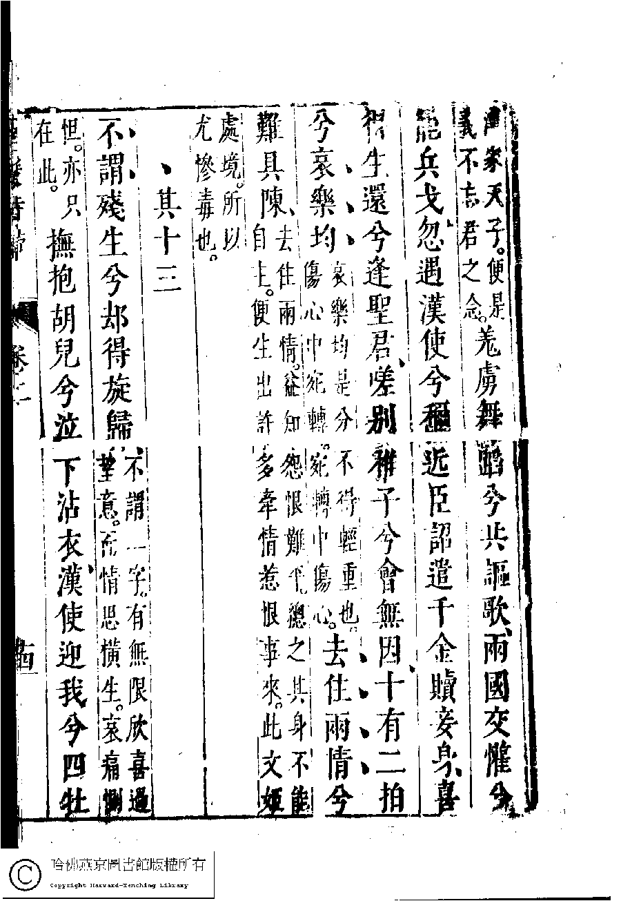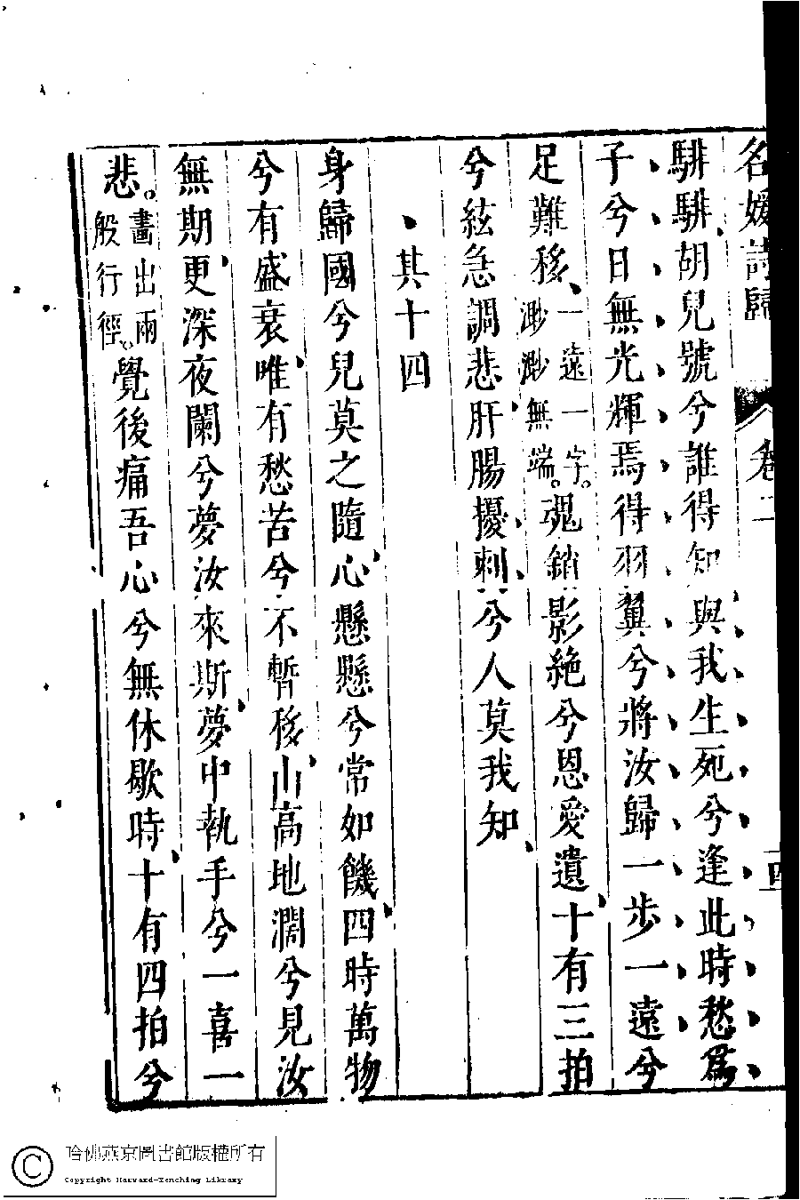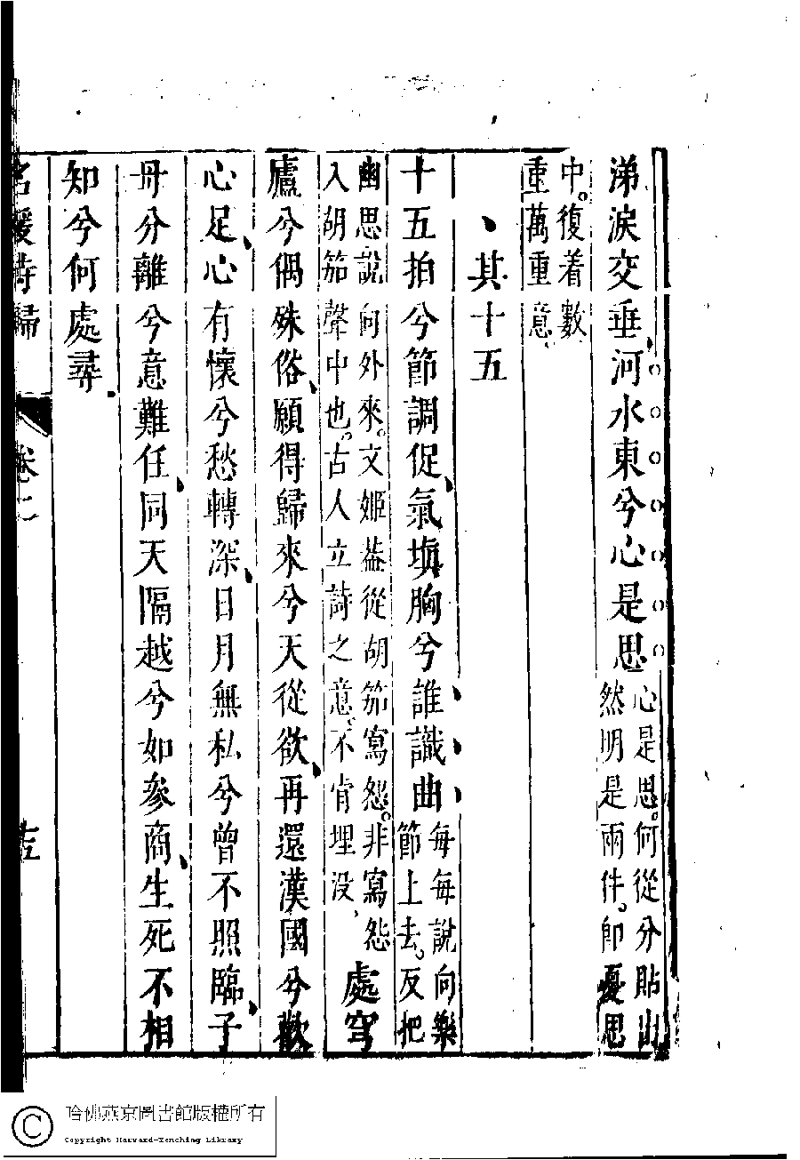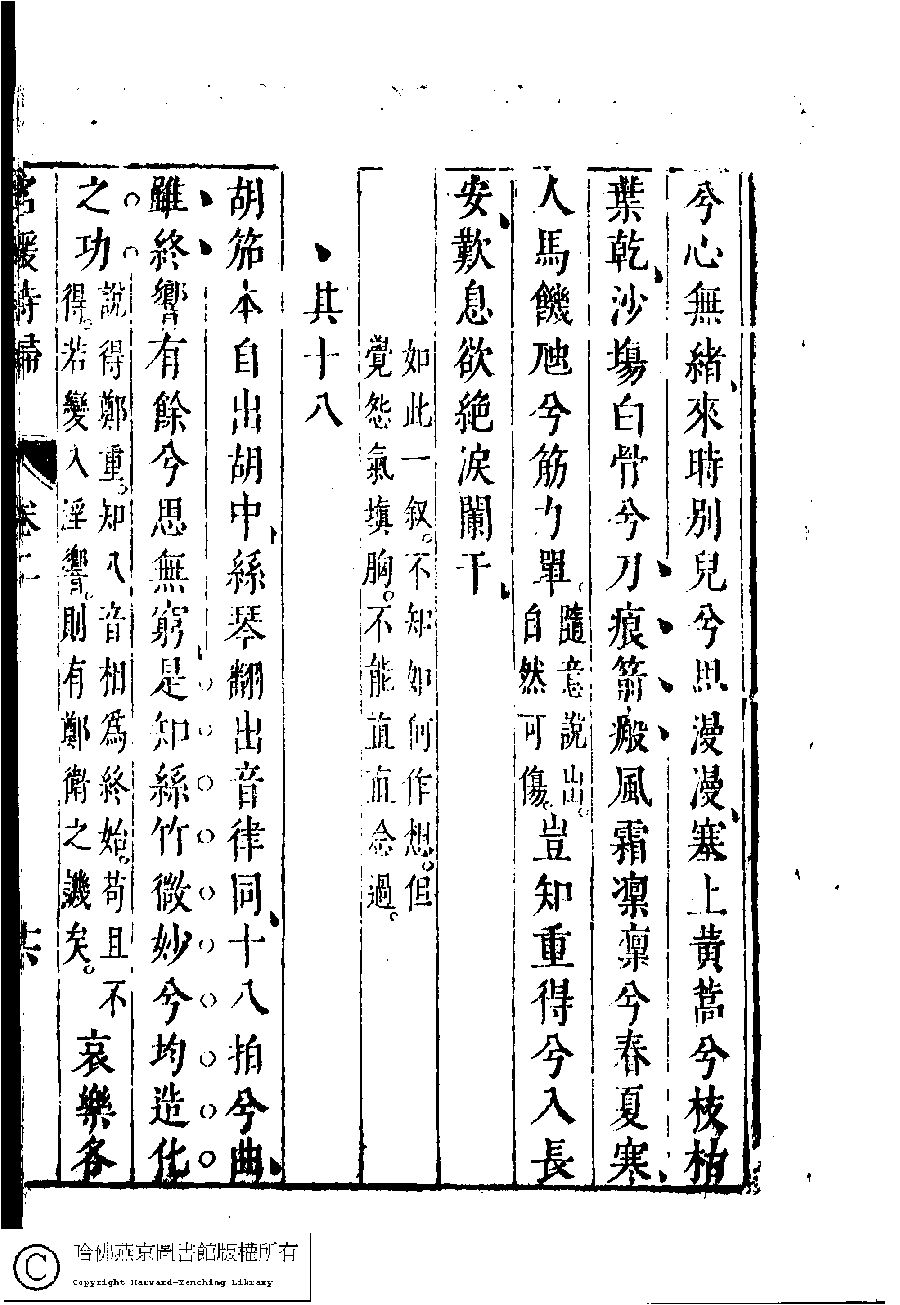 | 胡笳十八拍 Hu jia shi ba pai 詩 - 樂府 shi - yuefu 蔡琰﹐字文姬﹐又名昭姬﹐蔡文姬 Cai Yan, zi: Wenji 名媛詩歸﹕三十六卷(鍾惺點次) Ming yuan shi gui: 36 juan (edited by Zhong Xing, Ming dynasty) , pp. 2.10a,2.10b,2.11a,2.11b,2.12a,2.12b,2.13a,2.13b,2.14a,2.14b,2.15a,2.15b,2.16a,2.16b,2.17a,2.9a,2.9b. |