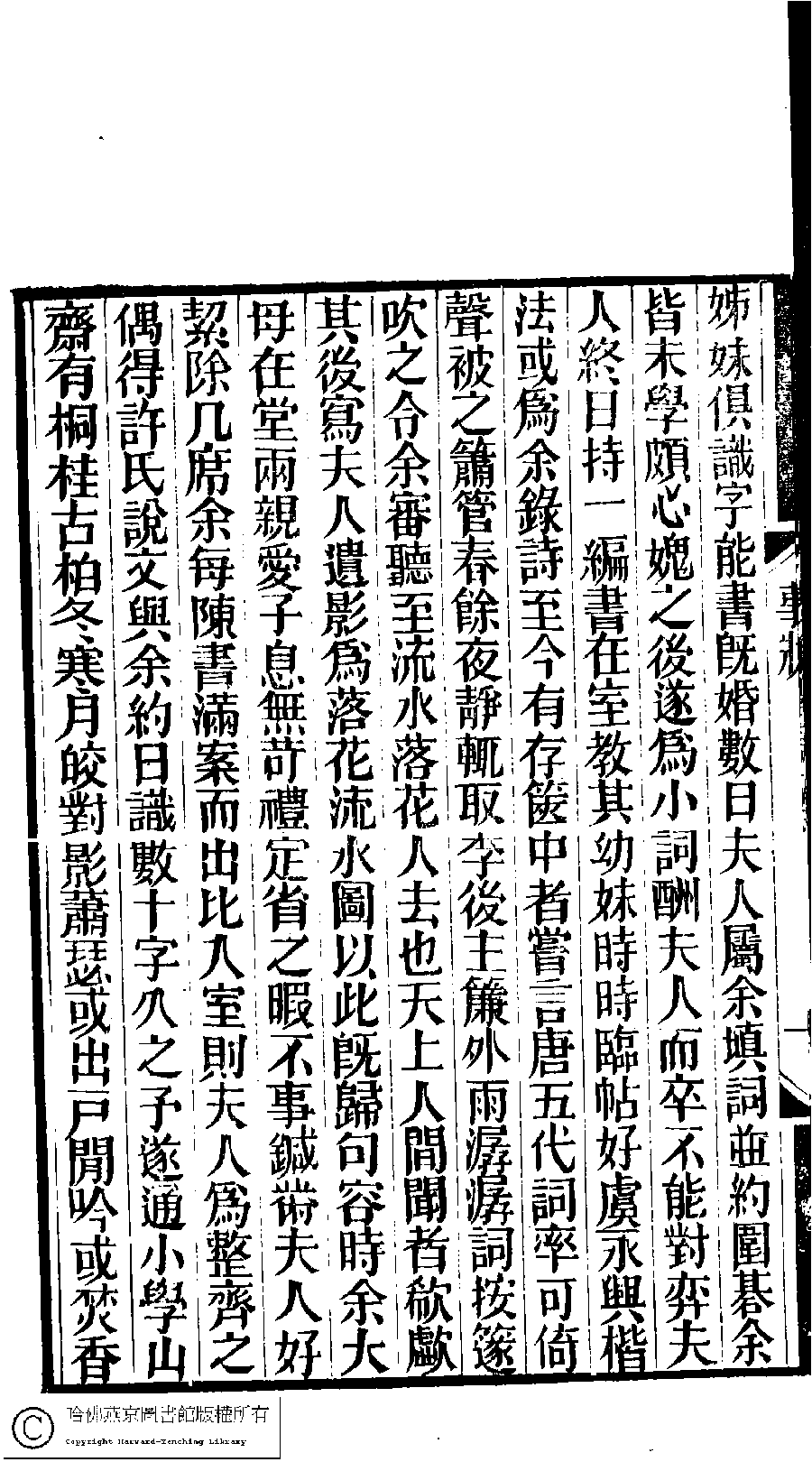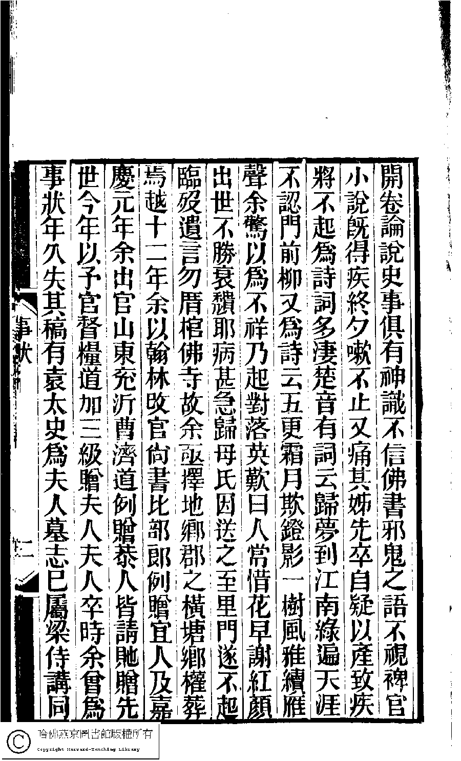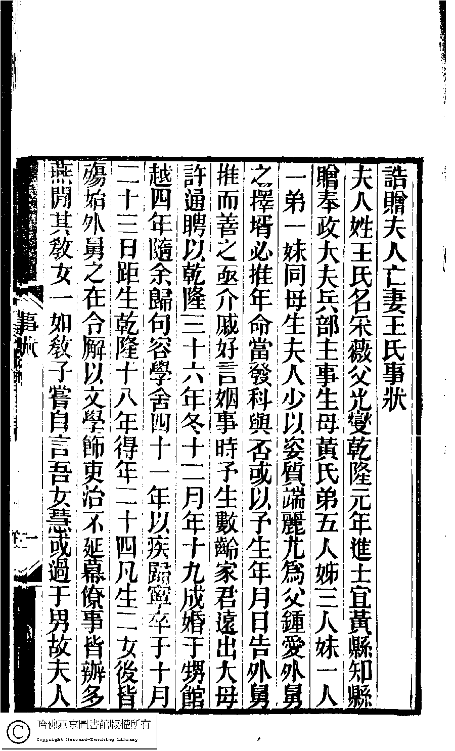 | 誥贈夫人亡妻王氏事狀 Gao zeng fu ren wang qi Wang shi shi zhuang 文﹕行狀 Wen: Xing zhuang 孫星衍﹐號淵如﹐字伯淵﹐又名季逑 Sun Xingyan, hao: Yuanru, zi: Boyuan 林下雅音集﹕五種(淸冒俊輯) 長離閣集: 一卷 Lin xia ya yin ji: 5 zhong (edited by Mao Jun, Qing dynasty) Chang li ge ji: 1 juan, pp. 事狀.1a,事狀.1b,事狀.2a,事狀.2b. |