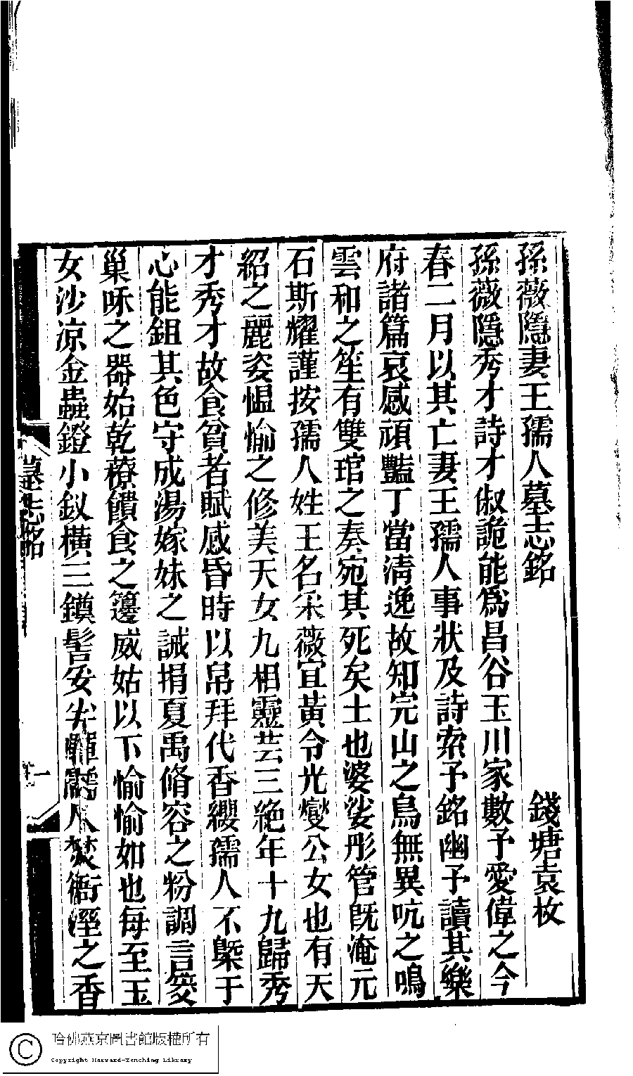 | 孫薇隱妻王孺人墓志銘 Sun Weiyin qi Wang ru ren mu zhi ming 文﹕墓誌銘 Wen: Mu zhi ming 袁枚﹐號簡齋﹐字子才﹐又名隨園 Yuan Mei, hao: Jianzhai, zi: Zicai 林下雅音集﹕五種(淸冒俊輯) 長離閣集: 一卷 Lin xia ya yin ji: 5 zhong (edited by Mao Jun, Qing dynasty) Chang li ge ji: 1 juan, pp. 墓志銘.1a,墓志銘.1b,墓志銘.2a,墓志銘.2b. |