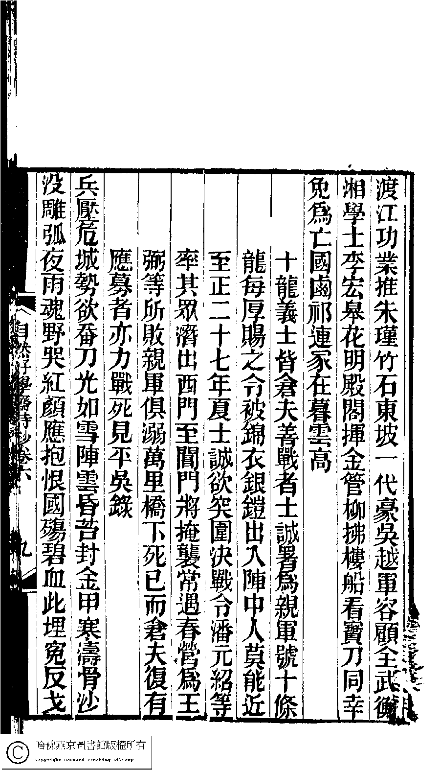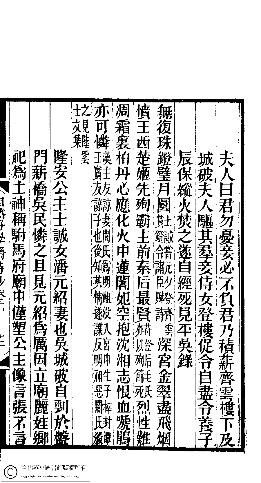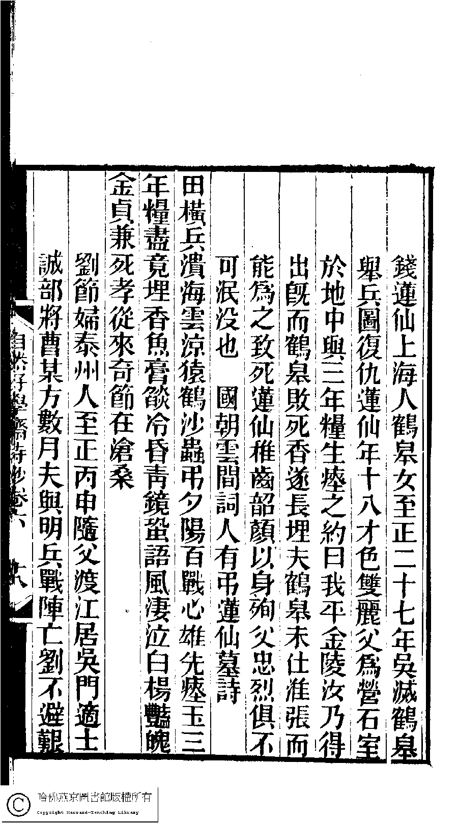 | 張吳紀事詩(二十五首) Zhang Wu ji shi shi (er shi wu shou) 詩 - 七言律詩 shi - qiyanlüshi 汪端﹐號小韞﹐字允莊 Wang Duan, hao: Xiaoyun, zi: Yunzhuang 林下雅音集﹕五種(淸冒俊輯) 自然好學齋詩鈔: 十卷 Lin xia ya yin ji: 5 zhong (edited by Mao Jun, Qing dynasty) Zi ran hao xue zhai shi chao: 10 juan, pp. 6.10a,6.10b,6.11a,6.11b,6.12a,6.12b,6.13a,6.13b,6.14a,6.14b,6.15a,6.15b,6.16a,6.16b,6.17a,6.17b,6.18a,6.18b,6.1b,6.2a,6.2b,6.3a,6.3b,6.4a,6.4b,6.5a,6.5b,6.6a,6.6b,6.7a,6.7b,6.8a,6.8b,6.9a,6.9b. |