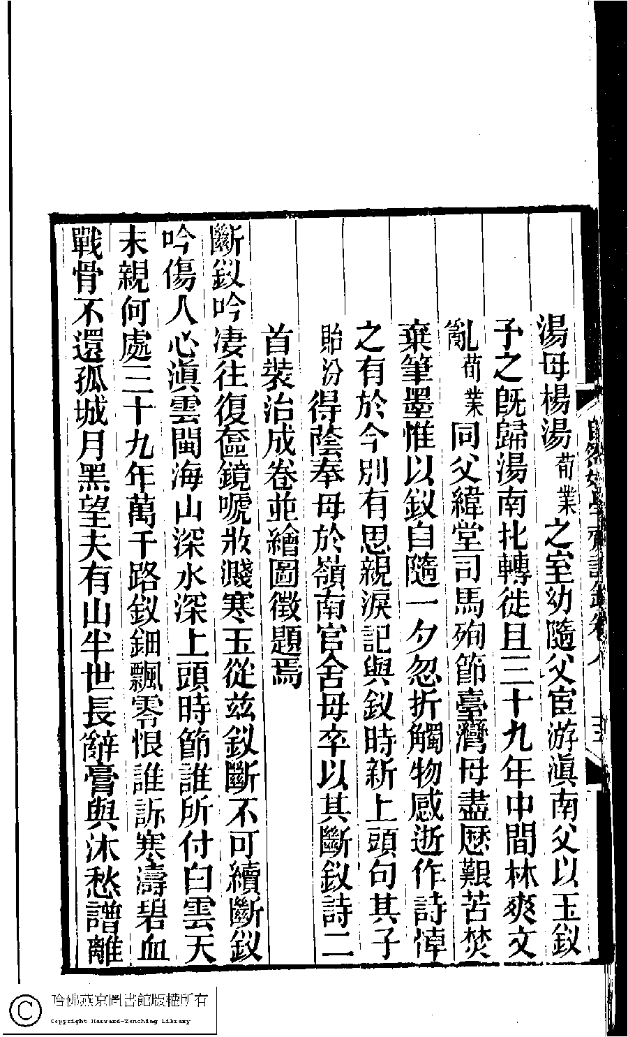 | 題吟釵圖後﹕并序 Ti Yin chai tu hou: Bing xu 詩 - 雜言詩 shi - zayanshi 汪端﹐號小韞﹐字允莊 Wang Duan, hao: Xiaoyun, zi: Yunzhuang 林下雅音集﹕五種(淸冒俊輯) 自然好學齋詩鈔: 十卷 Lin xia ya yin ji: 5 zhong (edited by Mao Jun, Qing dynasty) Zi ran hao xue zhai shi chao: 10 juan, pp. 8.15a,8.15b,8.16a. |